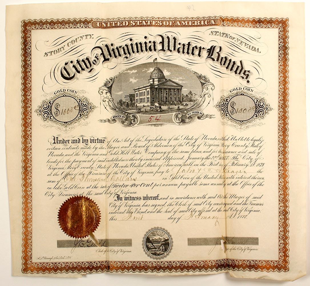 $1000 Gold Coin water bond from Virginia City, NV, #54. Issued January 1, 1877 to Sutro and Co. Mayor and clerk signatures are punched. HWAC# 61358 Date: 1877 Location: Virginia City, Nevada