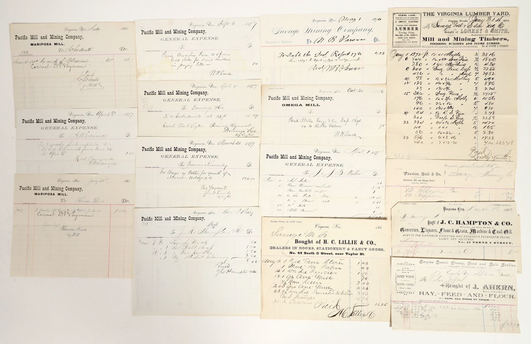 Lot of 15. Includes 14 Virginia City, NV billheads and one Eureka, NV billhead. Comstock group includes: Lonkey & Smith (1874, Virginia Lumber Yard); Wheeler, Hall & Co. (1887, hardware & mining goods); HC Lillie & Co. (1860s, bookstore); JC Hampton & Co. (1872, groceries and liquor); Savage Mining Co. (1894); and nine billheads from the Pacific Mill & Mining Company, owned by Mackay & Fair (Omega Mill, Mariposa Mill, and General Expense, 1870s-80s). Eureka billhead is J. Ahern, Empire Corral Livery, 1887. Some have tape repairs. Please inspect.