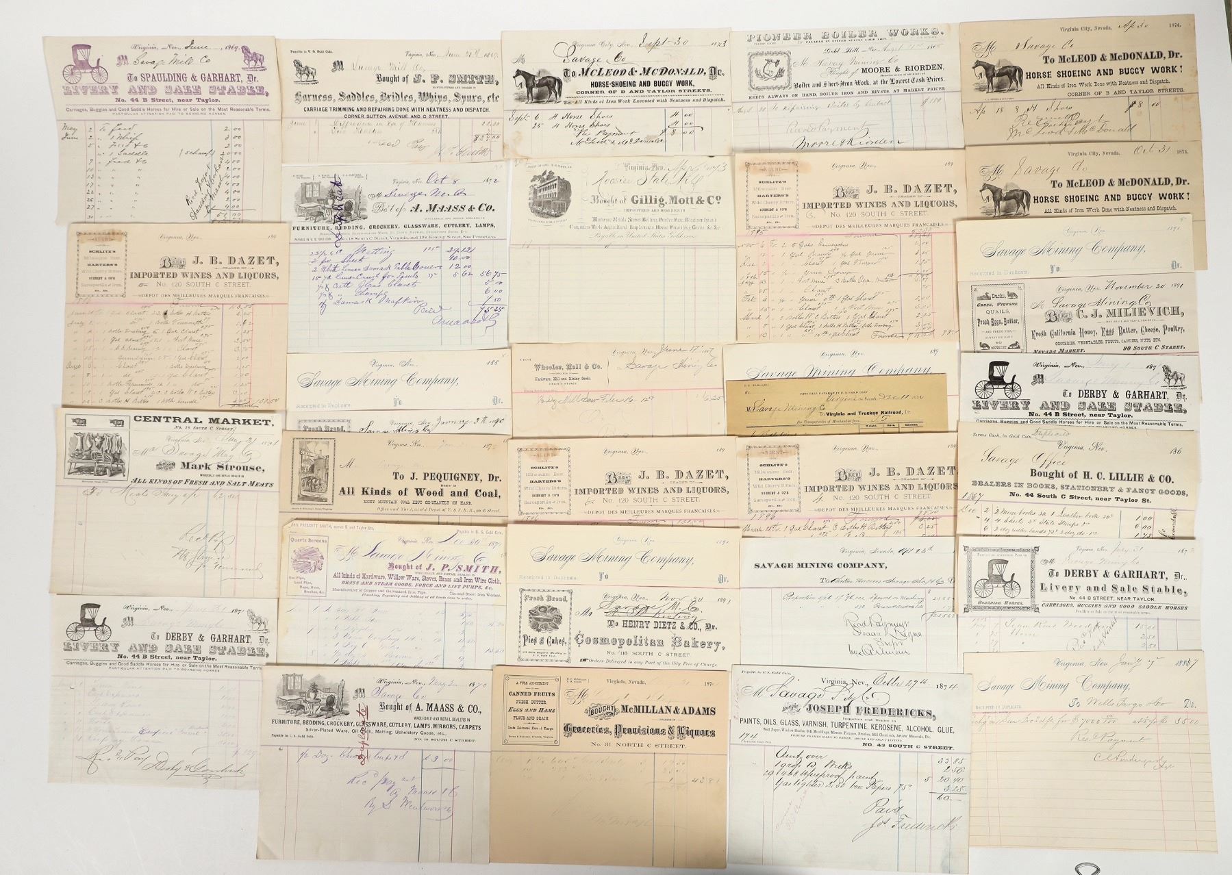 Lot of 30. Some duplication. Many pictorial. One Gold Hill, the rest are Virginia City. 1860s-90s. This is a great group! Includes: Gillig, Mott & Co., McLeod & McDonald, Derby & Garhart, Wheeler, Hall & Co., Mark Strouse, JP Smith, J. Pequigney, J.B. Dazet, Henry Dietz & Co., Savage Mining Company, McMillan & Adams, Joseph Fredericks, A. Maass & Co., HC Lillie & Co., Moore & Riorden, CJ Milievich, etc. Please inspect!