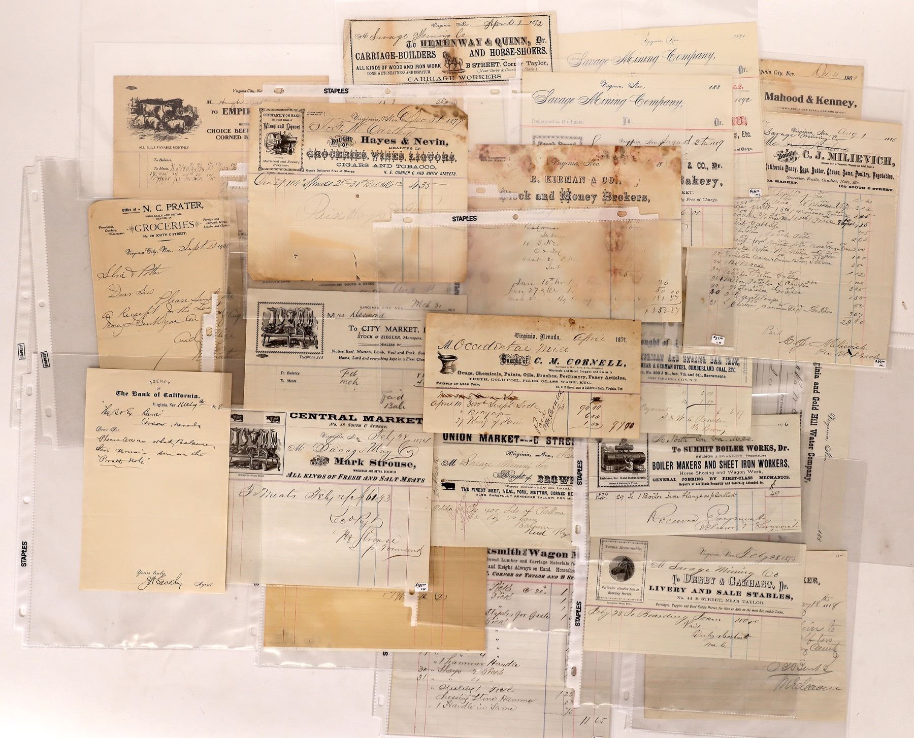 Virginia City billhead collection from the 1800s and 1900s. Billheads include The Cosmopolitan Bakery, Virginia Steam Coffee & Spice Mills, The City Market, N.C. Prater Groceries, Wines & Liquors, The Empire Market and many more.