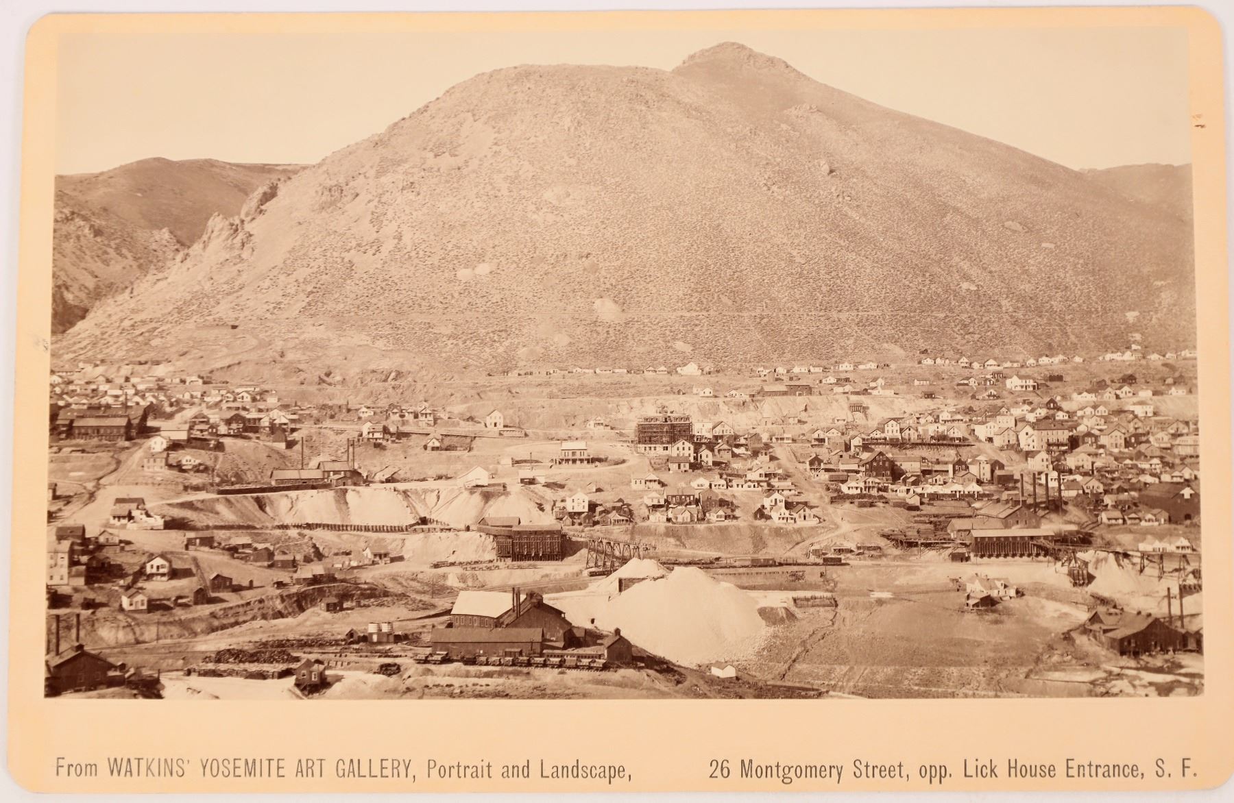 From Watkins' Yosemite Art Gallery, Portrait and Landscape, 26 Montgomery Street, opp. Lick House Entrance, S.F. Good contrast and sharp focus. View, possibly taken from the Combination Shaft, looks back at Mt. Davidson with the Divide at center, Gold Hill to the left, and Virginia City to the right. 4.25 x 6.5"