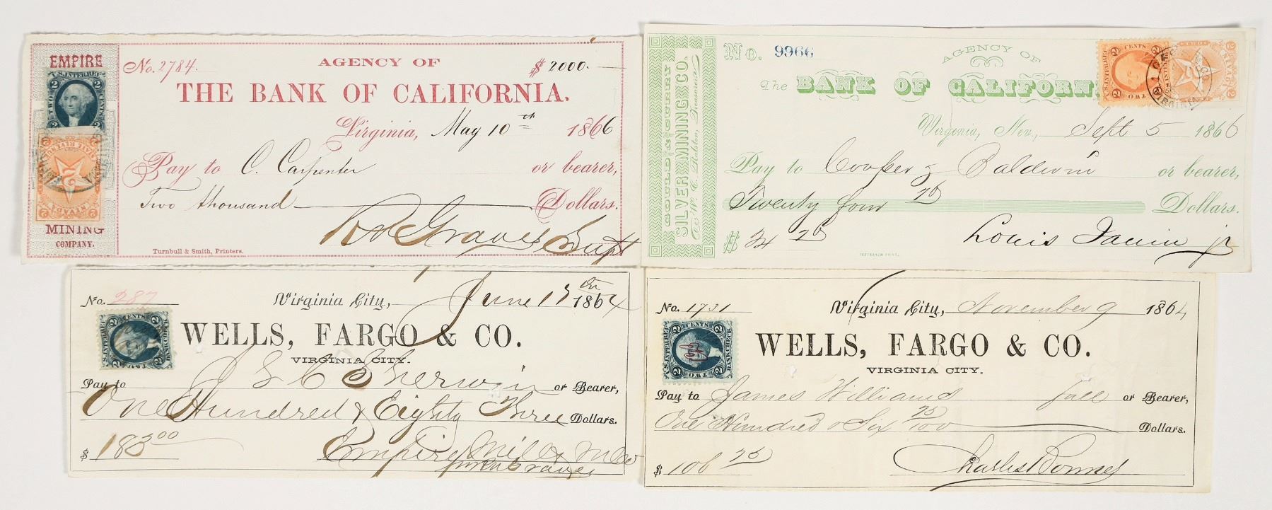 Lot of 4 early checks, 2 each for the Empire and Gould & Curry. 1-2) Empire Mill & Mining Company. 1864 territorial Wells Fargo check to JSC Sherwin and an 1866 check to C. Carpenter with NV adhesive revenue stamp, both signed by RN Graves. 3-4) Gould & Curry. 1864 territorial Wells Fargo check signed by Charles Bonner and 1866 Bank of California check signed by Louis Janin with NV adhesive revenue stamp.