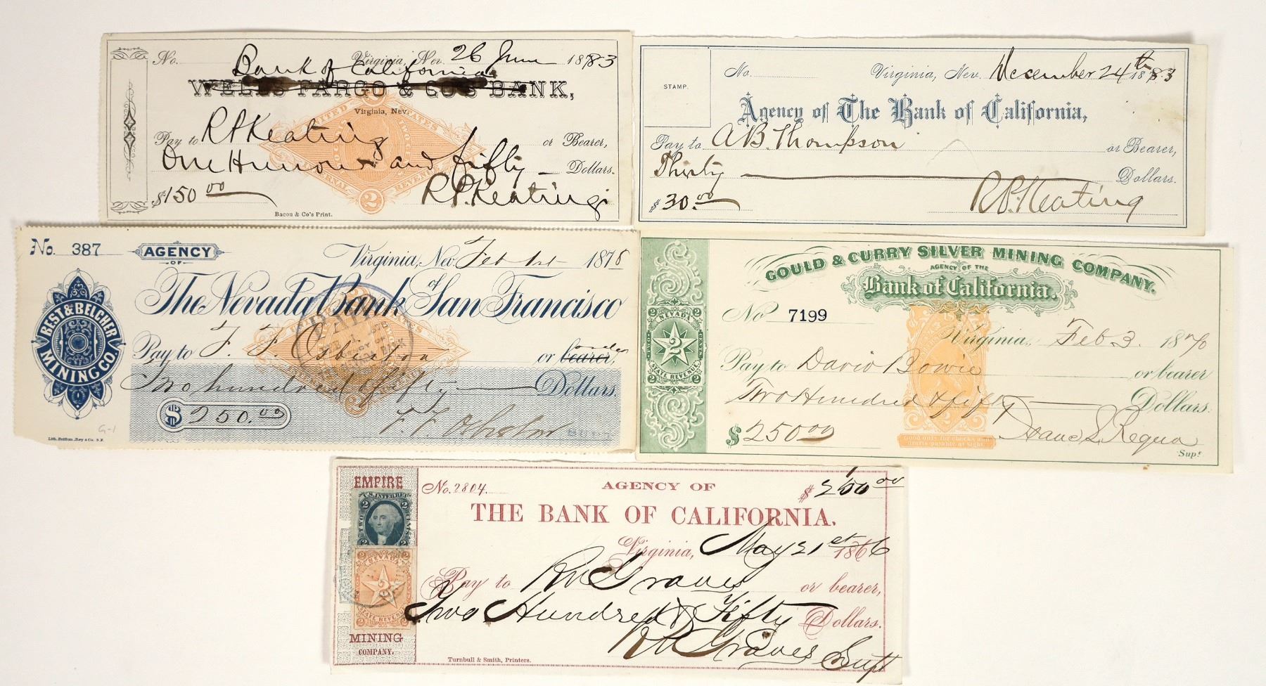 Lot of 5 different. Includes: 1866 Empire Mill & Mining Co. check issued to supt. RN Graves; 1876 Gould & Curry issued to David Bowie (earlier supt. for the mine), RN-B and green printed NV stamp, signed by Isaac Requa; 1878 Best & Belcher issued to and signed by supt. FF Osbiston, RN-G; 1883 check to AB Thompson (who worked for Hale & Norcross and Sutro Tunnel), signed by RP Keating; and 1883 issued to and signed by RP Keating as supt. of the Savage Mine, RN-G.