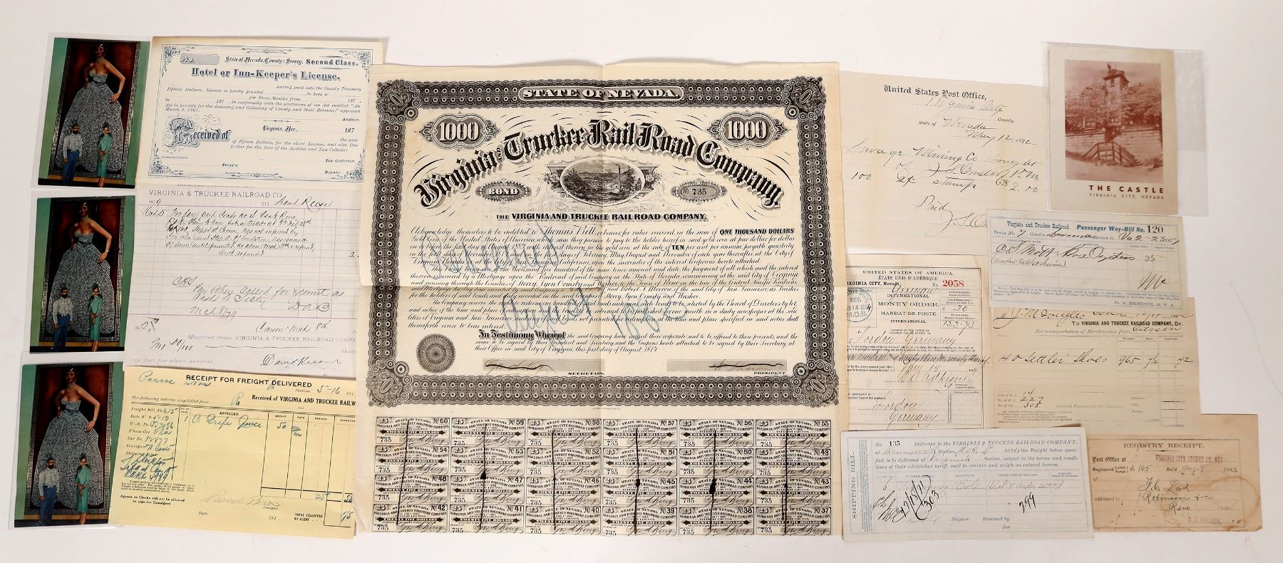 Virginia City history can be your in these 12 pieces of ephemera, including a blank Storey County Hotel & In-Keeper's License, a stock certificate from the Virginia & Truckee Railroad, freight receipts and more. All are in very nice condition. Please see photos for more details. Virginia City Nevada