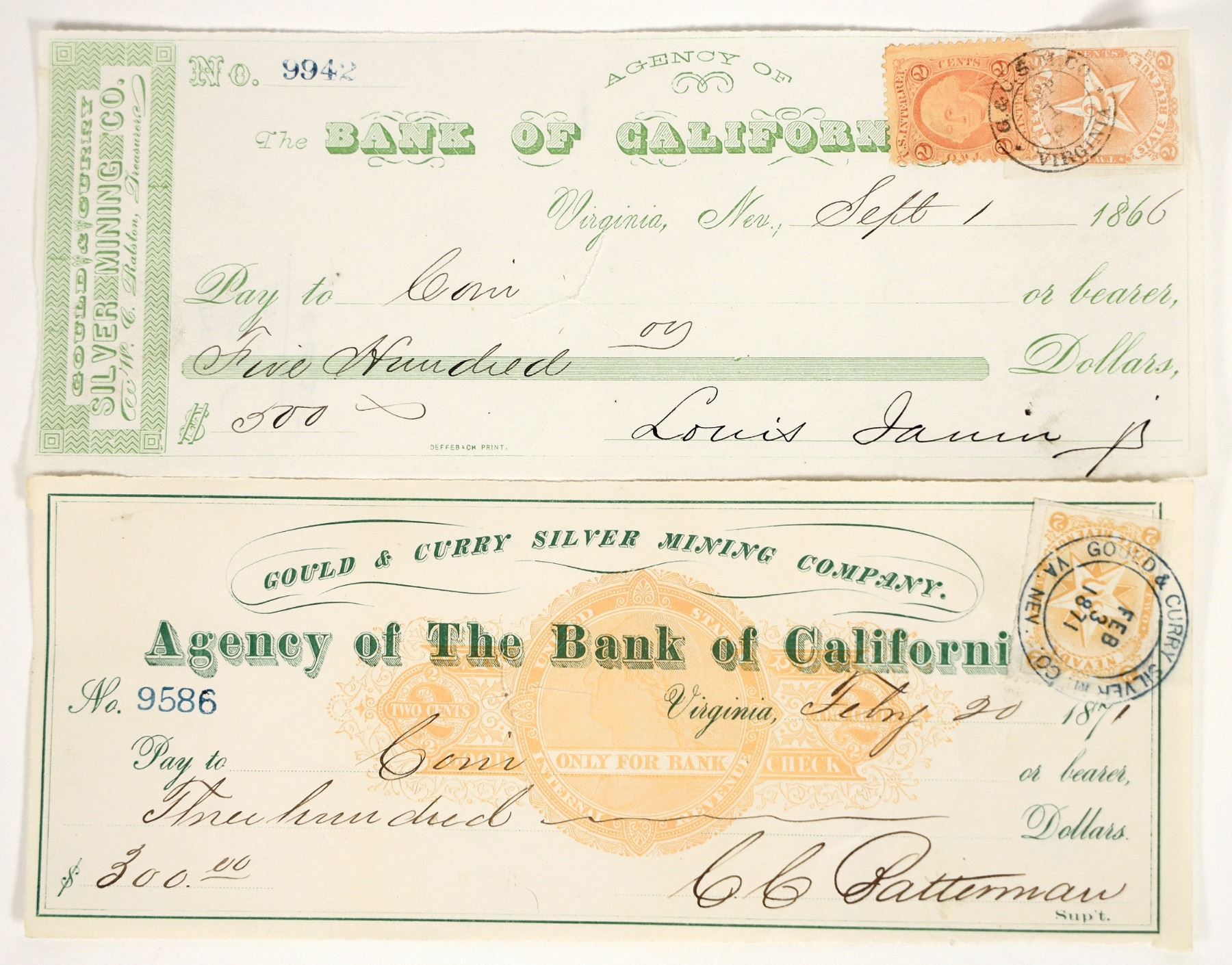 Lot of 2 (two different styles). Both issued for "Coin." One issued in 1866, signed by Louis Janin as supt., with NV and US IR stamps. One issued in 1871, RN-C plus orange NV revenue with tied cancel, signed by CC Batterman. Was the 1871 check paid in Carson City Mint seated dollars?