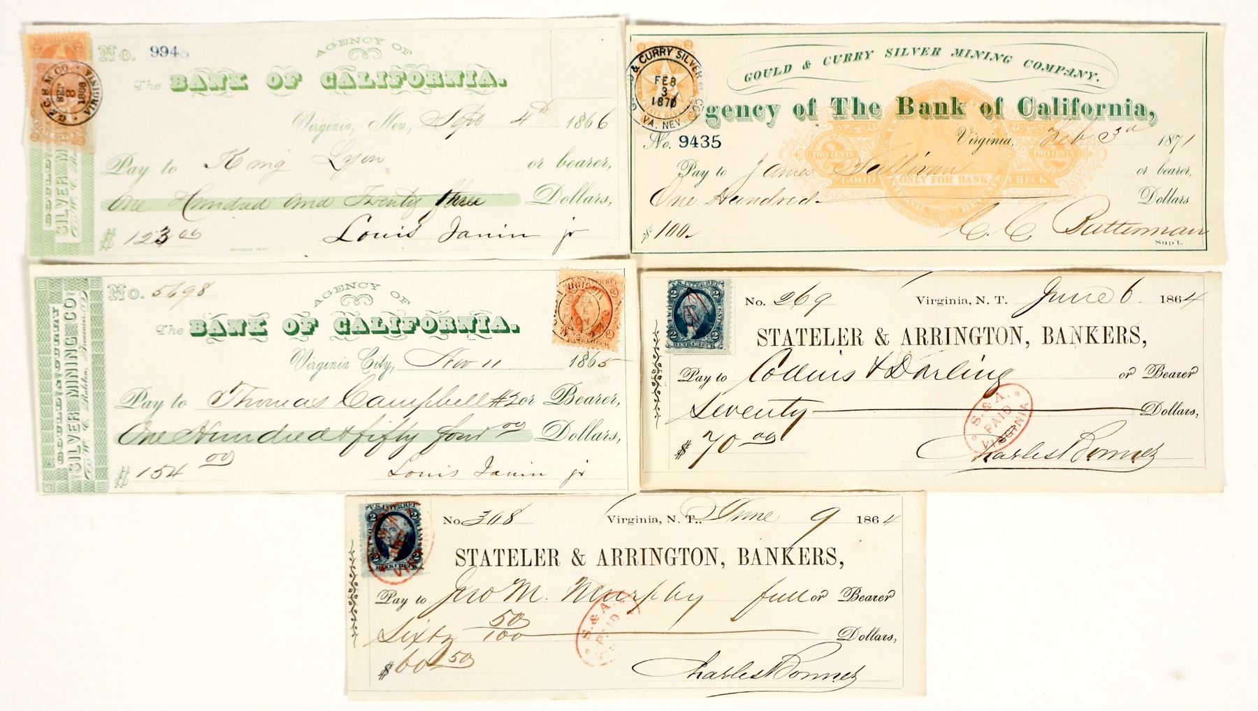 Lot of 5. This is a study group in the cancels used on adhesive revenue stamps. Four of the checks have tied cancels (applied after the stamp was put on the check). One has a pre-cancel (the sheet of stamps was cancelled before check application). All are Gould & Curry. Includes: two Stateler & Arrington 1864 checks with red cancels (one a double); 1865 with pre-cancel; 1866 with tied cancel on orange NV; and 1871 with tied cancel plus RN-C. Please inspect.