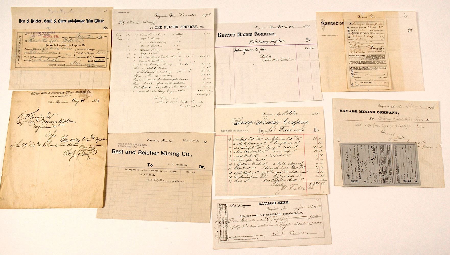 Lot of 10. 1) Savage Mining Company: 1876 paystub (F.F. Osbiston Supt.); two different Savage Mining Co. billheads for subscriptions to Mining & Scientific Press, 1876 & 1878; 1892 billhead to Jos. Fredericks; and 1878 billhead to St. Mary's Hospital. 2) Fulton Foundry billhead, 1878, for goods purchased by the Savage Mining Company. 3) Hale & Norcross Silver Mining Co. letterhead, dateline San Francisco, 1887, to RP Keating, supt. in Virginia City. 4) Two Best & Belcher billheads. 1911 and 1912, when it was the Best & Belcher, Gould & Curry & Savage Joint Winze. 5) Pacific Mill & Mining Co., Omega Mill, 1876, to Jos. Fredericks. Date: Location: Virginia City, Nevada HWAC# 572018