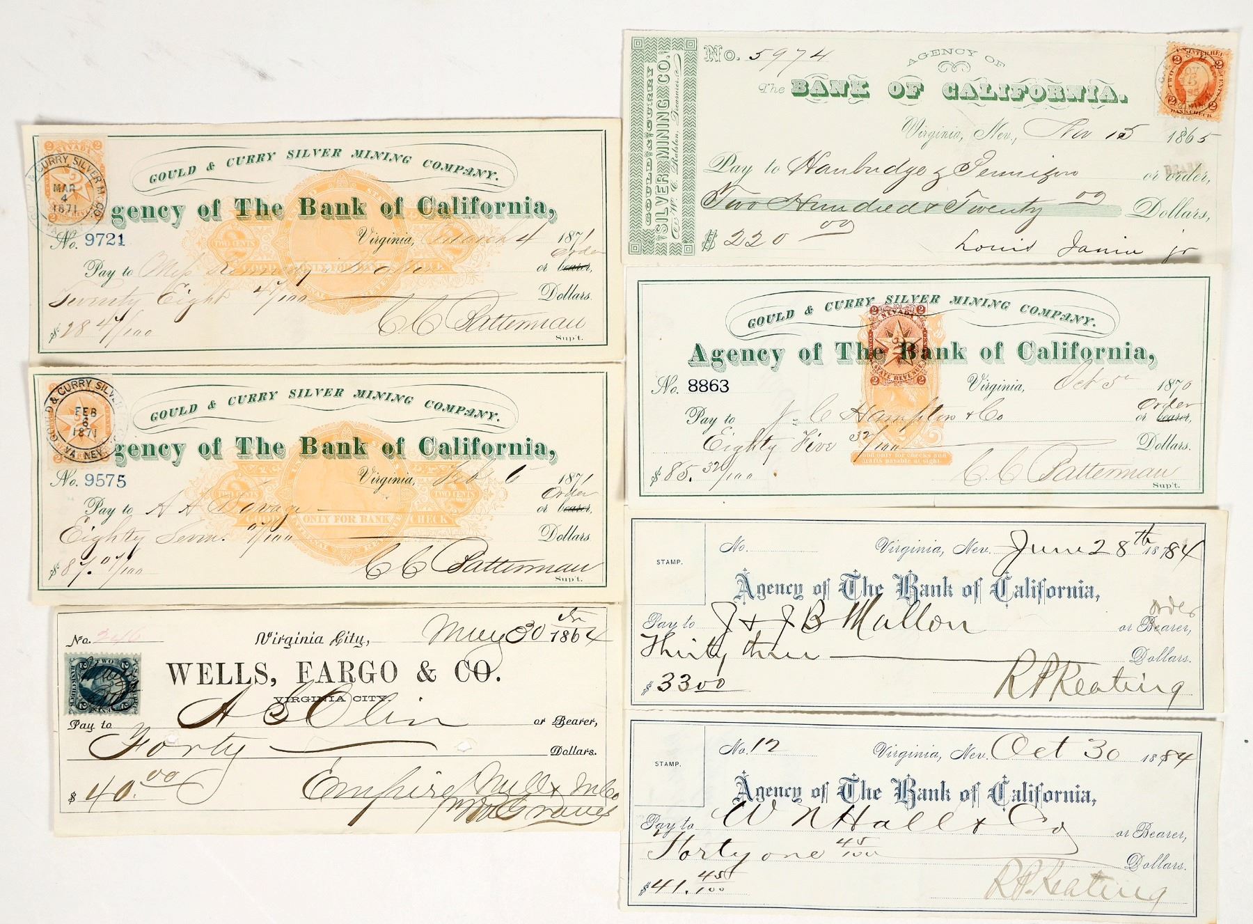Lot of 7. Includes: 1864 Wells Fargo Empire Mine to AS Oslin (horse, carriages); 1865 Gould & Curry to Hanbridge & Pennison (plumbers); 1870 Gould & Curry to JC Hampton & Co. (groceries, mill salt) with rare RN-B17b; 1871 G&C to Kennedy & Mallon (grocers) with RN-C and NV adhesive; 1871 G&C to AA Savage (hauling) with RN-C and NV adhesive; 1884 to J&JB Mallon (grocers); and 1884 to WN Hall & Co. (hardware).