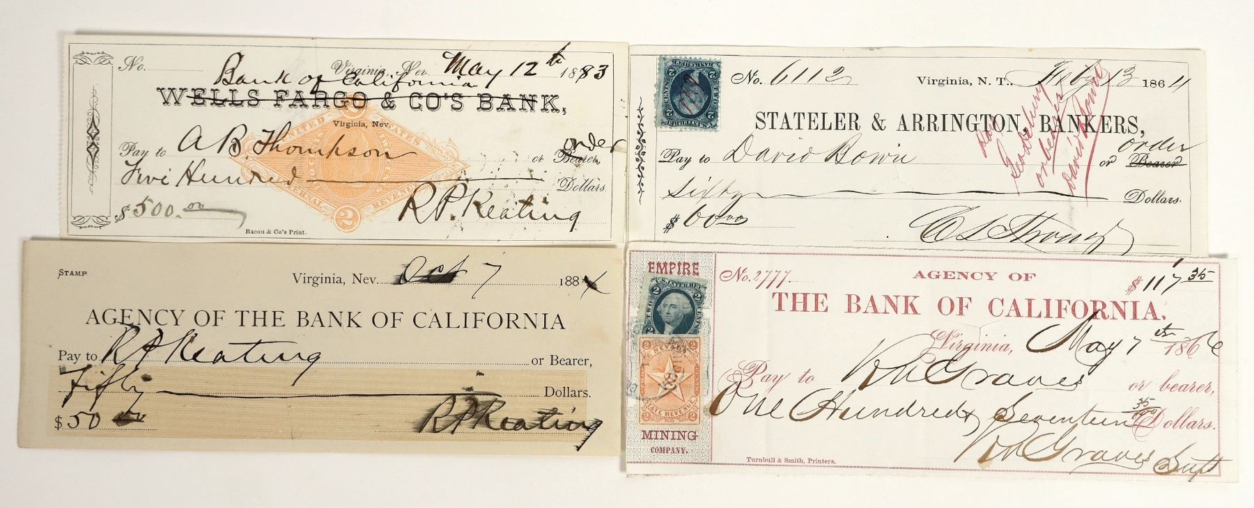 Lot of 4 different. Includes: 1864 territorial Gould & Curry check issued to David Bowie (who would supt. for Gould & Curry); 1866 Empire Mill & Mining Co. check issued to RN Graves and signed by Graves as supt.; 1883 check to AB Thompson (who also worked for the Hale & Norcross and the Sutro Tunnel); and 1884 check issued to and signed by RP Keating (Savage Mine).