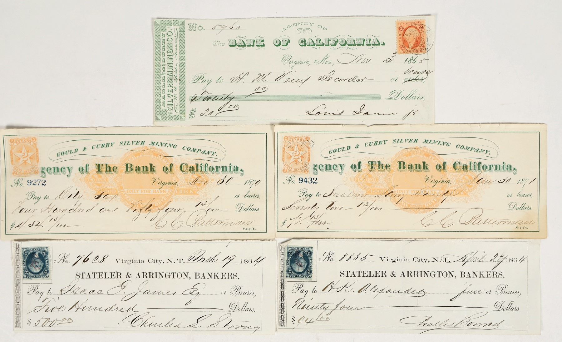 Lot of 5 Gould & Curry checks. Four different superintendents: Bonner, Strong, Janin, and Batterman. Includes: 1864 Stateler & Arrington to HK Alexander, city tax collector (1864 Collins directory); 1864 S&A to Isaac E. James, county surveyor (Collins directory); 1865 to HM Vesey, recorder; 1870 for City Tax (with RN-C and NV adhesive); and 1871 to Treasurer Storey County (also with RN-C, NV adhesive).