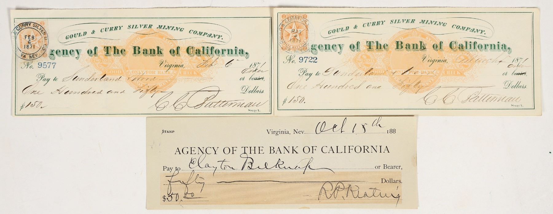 Lot of 3 different. Two Gould & Curry Silver Mining Company issued to Sunderland & Wood, 1871, with RN-C and orange Nevada adhesive revenue stamps. Sunderland was partners with AP Crittenden in the territorial years. Third check is to Clayton Belknap, signed by RP Keating, 1880s. Attorneys were a large presence on the Comstock due to mining claim disputes, like the famous ledge vs. lodge case.