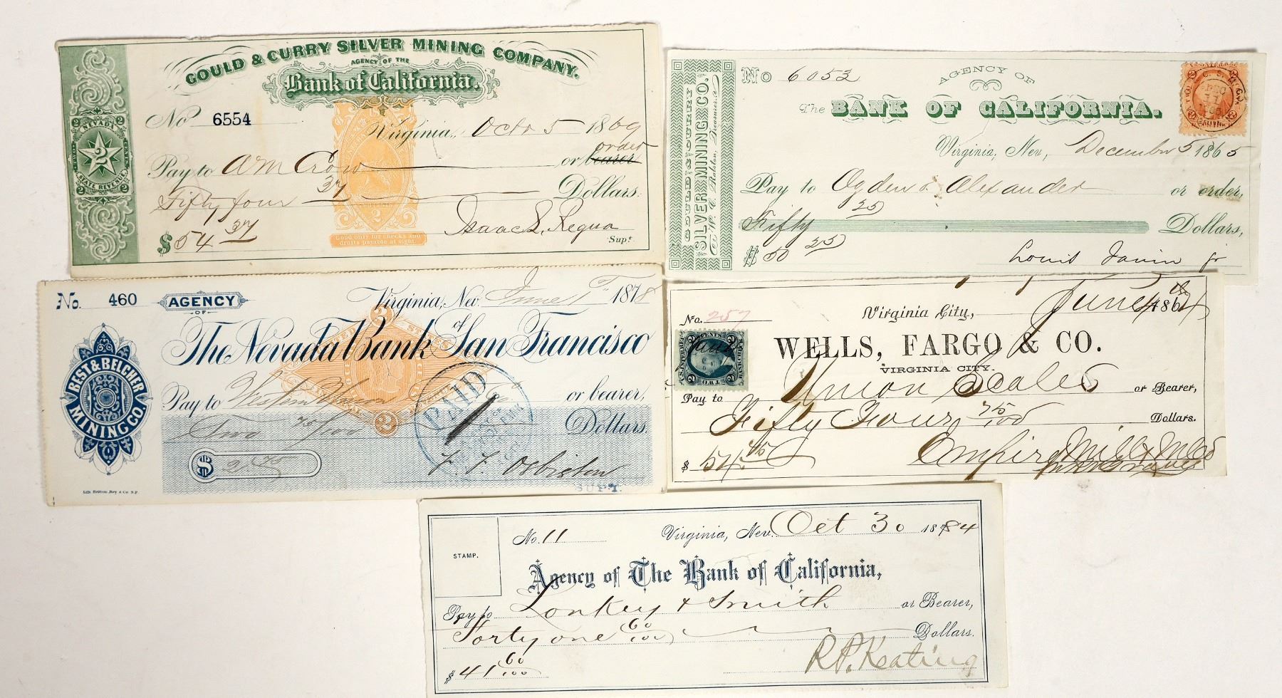 Lot of 5 different. Includes: 1864 Wells Fargo / Empire Mill & Mining Co. to Union Scales, signed by Graves; Best & Belcher to Western Union, 1878, RN-G, signed by FF Osbiston; two different Gould & Curry, 1865 to Ogden & Alexander signed by Louis Janin Jr., 1869 to AM Crow (lumber), RN-B, signed by Requa; and 1884 to Lonkey & Smith (lumber), signed by RP Keating.