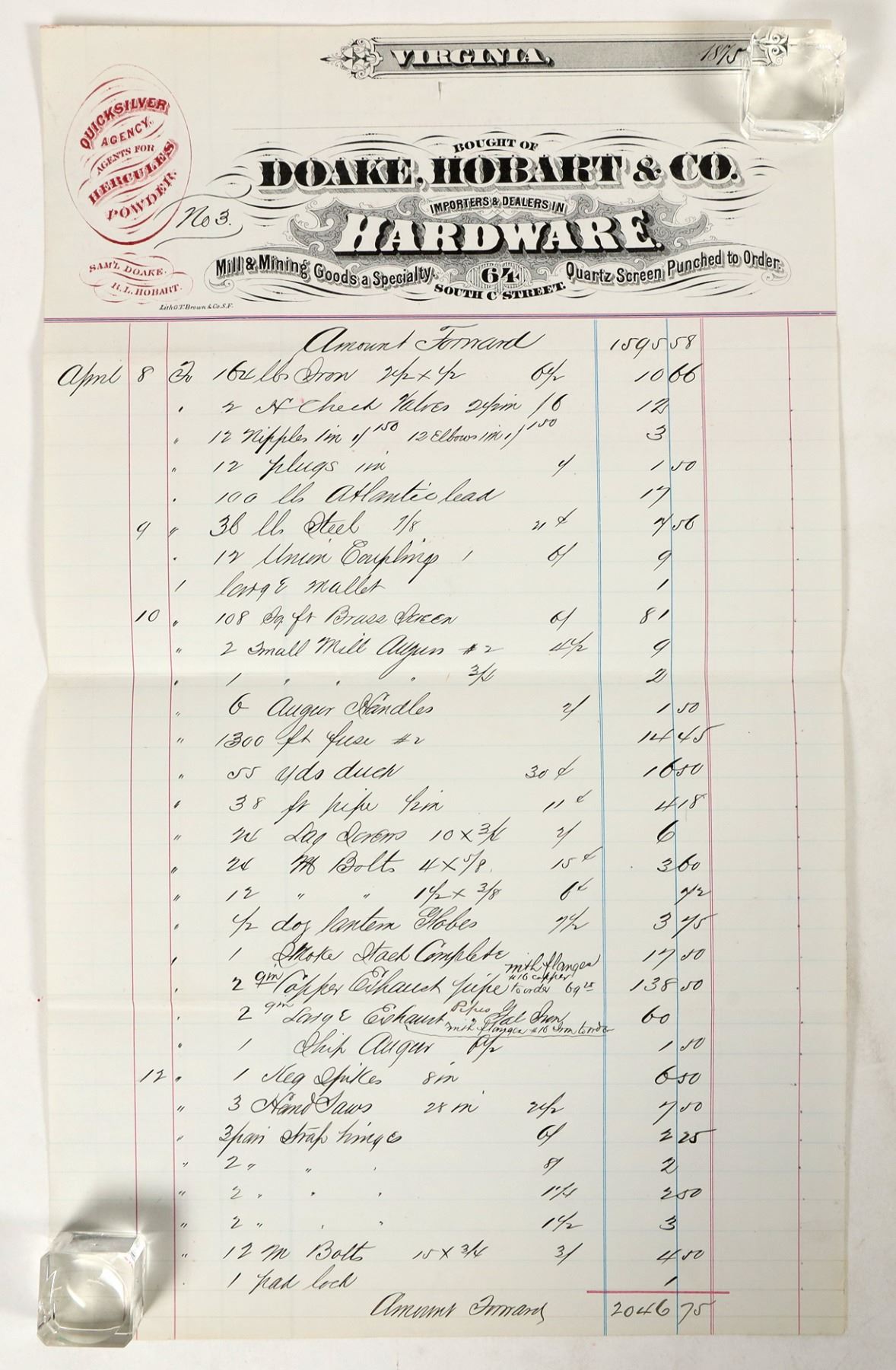 Virginia City, Nevada Mining Hardware Billhead Lith. by GT Brown, 1875 [195498]