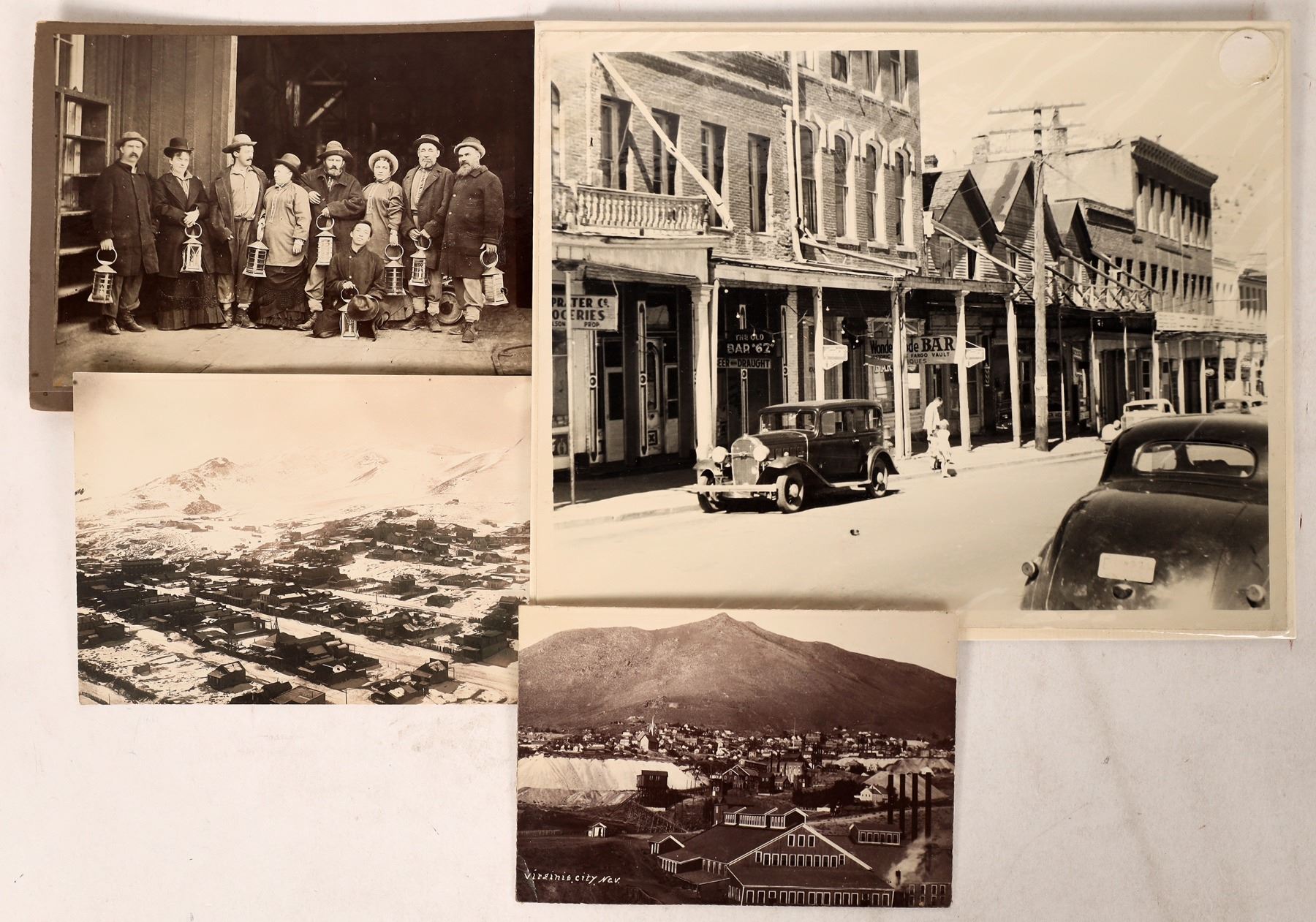 Virginia City, Nevada photos from the mid-1860s to the 1930s. There's an 8"x 10" of "C" Street, a 5"x 7" of miners with lantern, a postcard size photo of a stamp mill and a birds eye view of Eureka, Nevada. Nice group. Please see photos for more details. Virginia City Nevada