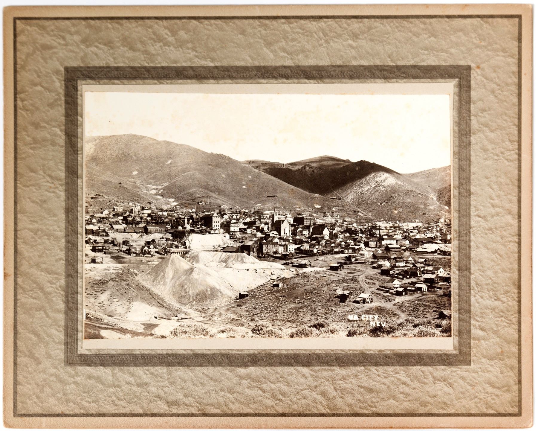 Birds' eye photograph of Virginia City, Nevada, c. 1900. Taken by the photographer, William Cann. This photograph shows the whole town. St. Mary's in the Mountains Catholic Church and the Fourth Ward School are visible in the center of this photograph. Mounted photograph, 10 x 8 inches overall. Good condition.