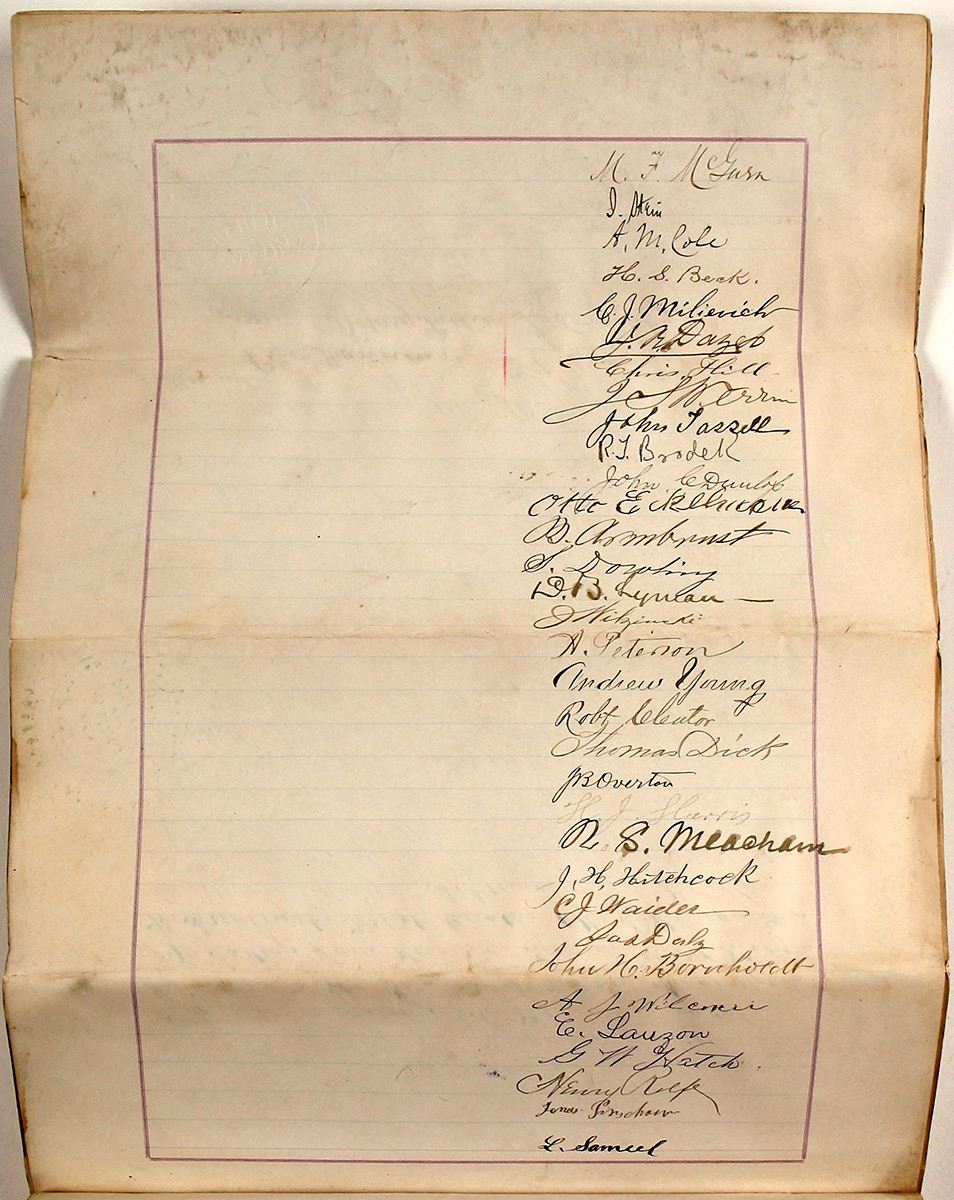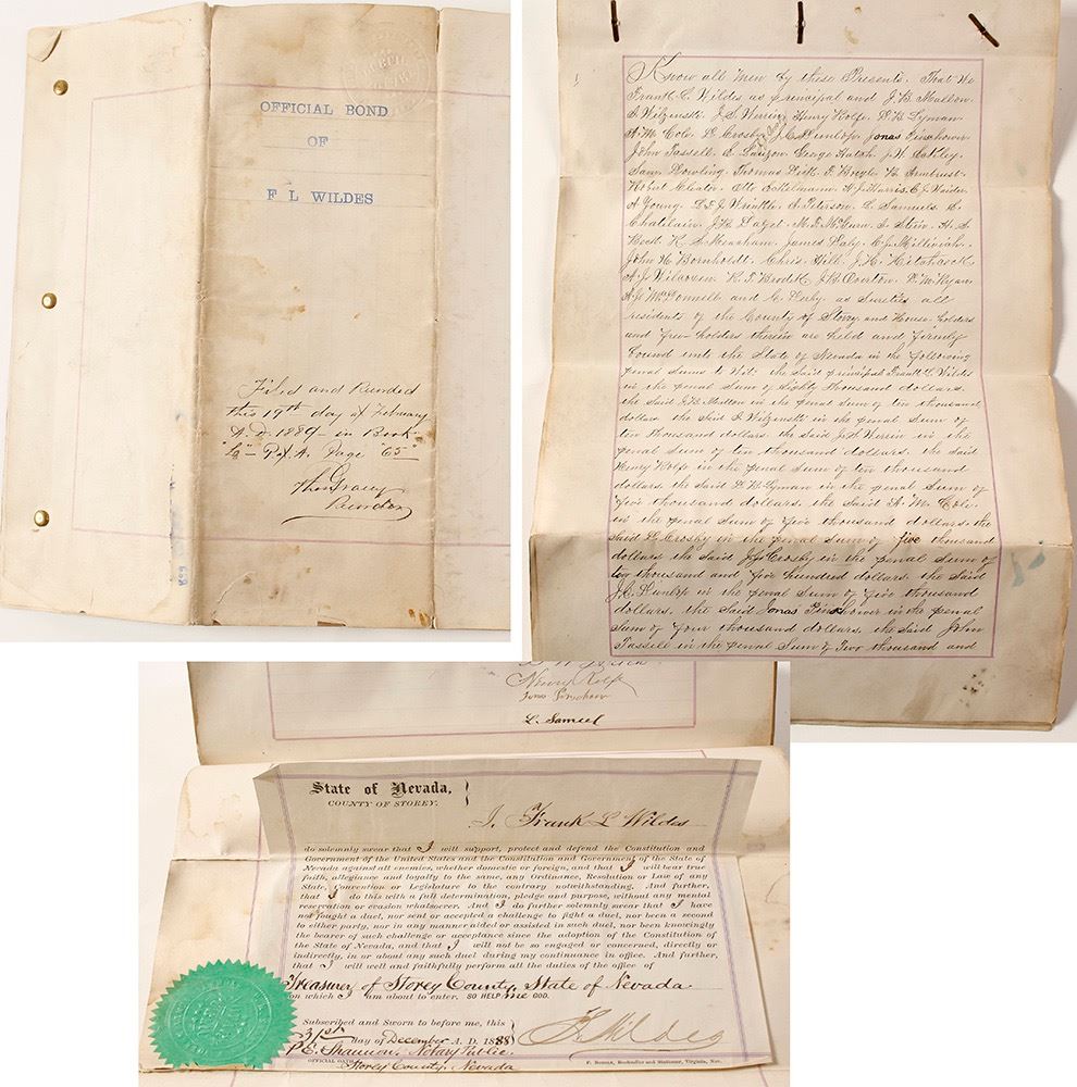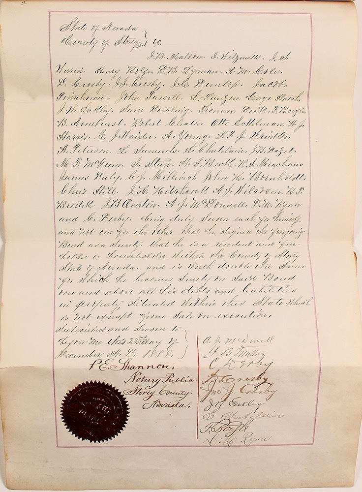 Major document signed by most of the top merchants of Virginia City, Nevada, 1888. The document is a surety bond guaranteeing performance of Wildes as Storey County Treasurer.