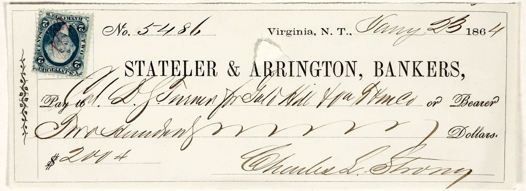 Gould & Curry check issued to Col. D.S. Turner for "Gold Hill & Va Dv M Co." Signed by Charles Strong as supt. Not endorsed. This would be David S. Turner, listed in the Collins 1864 directory as Judge for the Nevada Supreme Court. The mine is the Gold Hill & Virginia Divide Mining Company, also listed in Collins. The company had 1,000ft in the Gold Hill District. Turner's name appears in many territorial news articles. He was a Virginia City delegate for the Territorial Convention held in Carson. He was very pro-Union, and served as president for the Territorial National Committee for the National Union Party. He was also president of the Storey County Bible Society.