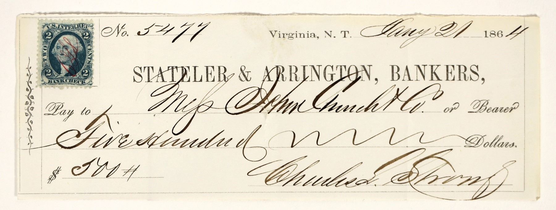 Stateler & Arrington check issued May 21, 1864 to John Church & Co. Signed by Charles Strong for the Gould & Curry Mining Company. Not endorsed. In February of 1862, John H Church, SA Glessner and JL Laird purchased the Carson City Silver Age. It was the newspaper that began printing in Carson City when the Territorial Enterprise moved to Virginia City in December of 1860. Church & Company moved the Silver Age plant to Virginia City and on November 4, 1862 began printing the Virginia Daily Union newspaper.