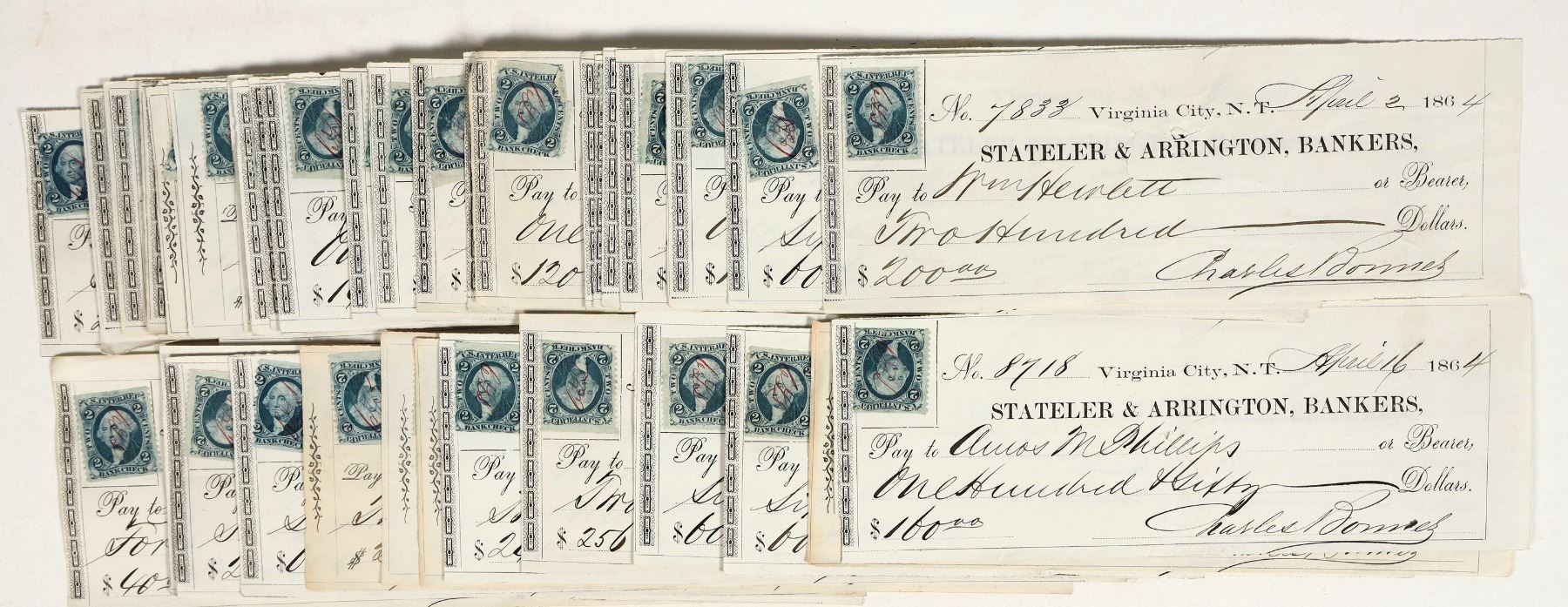 Lot of 50 checks issued by the Gould & Curry, all to workers of the company's mill, all listed in the 1864 Collins directory (available online for free). Issued in 1863-64, signed by Charles Strong and his successor Charles Bonner, who took over after Strong's mishandling of the extremely expensive company mill. Strong would later commit suicide. Most of these checks are signed by Bonner. Please inspect. This mill was built at considerable cost in 1862 and located at the confluence of Sixmile and Sevenmile Canyons. By the end of 1863, approx. $900,000 had been spent. Charles Strong was replaced as supt. by Charles Bonner, and the mill was reconstructed for a cost of $560,000. It used both stamping mills and a variant of the Washoe Pan Process (Veatch Process) along with Spanish style Patio Process. In 1866, it had 80 stamps and a 100-ton-a-day capacity. In 1871, the mill was sold to Parke & Bowie, but shutdown soon after.