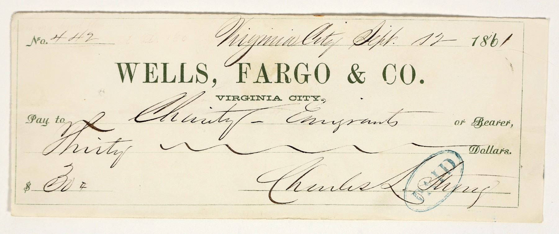 Extremely early 1861 Comstock check from Wells Fargo / Gould & Curry Mining Company. Issued for "Charity--Emigrants." Signed by mine supt. Charles Strong. Clearly this is for a fundraiser for a group down on their luck. We have not located the story as of this publishing of this catalog, but surely there is one!