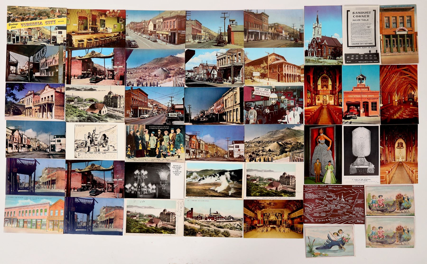 Lot of 40. Two RPC's and two pre-split. Postmarks: Virginia City, Reno Nv., Gold Hill Nv., South River N.J. Great collection of Virginia City Post Cards w/street scenes of different era's showing the town growing into what it is today. Photo of pogo nip surrounding the school on C st. Interiors of the different bars, Piper opera house, one card has amp of the town outlining some of the important area's, on of the Silver Queen, one telling how the town was named and more. Nevada Virginia CIty 1906-56 Ken Prag Collection