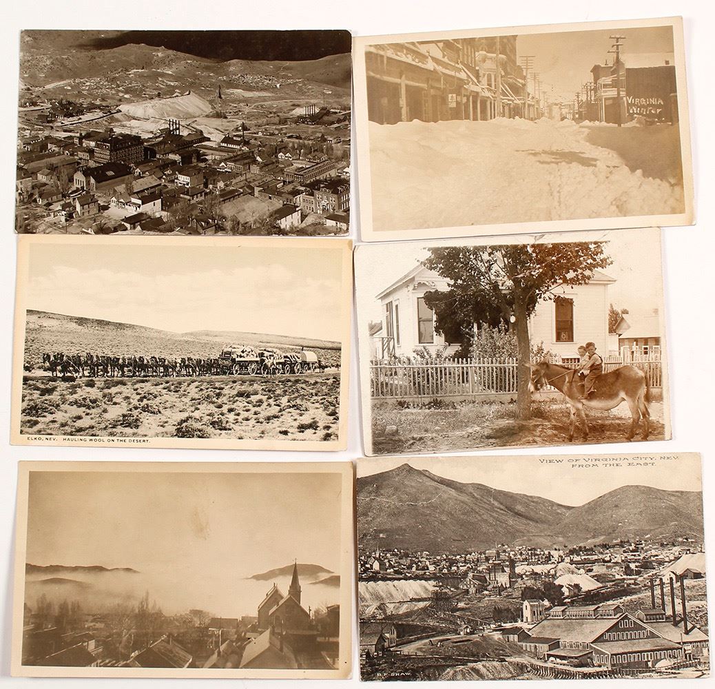 Lot of 6. Includes: RPC birds-eye of Virginia City made for the Comstock Golden Jubilee, 1909, mailed with long message; birds-eye of Virginia City from the East, mailed 1912; RPC showing fog rolling into town, unmailed; real photo of two children on donkey (with notation on back saying they are "Dad" and Uncle Joe); RPC of C. Street in Virginia City covered in snow, not mailed; and one non-Comstock postcard showing a horse team hauling wool in the desert near Elko. Provenance: Ayer Family Estate Date: Location: Virginia City, Nevada HWAC# 55518