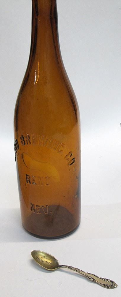 Small 4" sterling silver spoon with gold wash bowl engraved "Virginia Nev." Also a fancy Reno Brewing bottle, one of the best we've seen, with a very attractive bubble above the word "Reno". Quart. Date: Location: Virginia City, Nevada HWAC # 55970