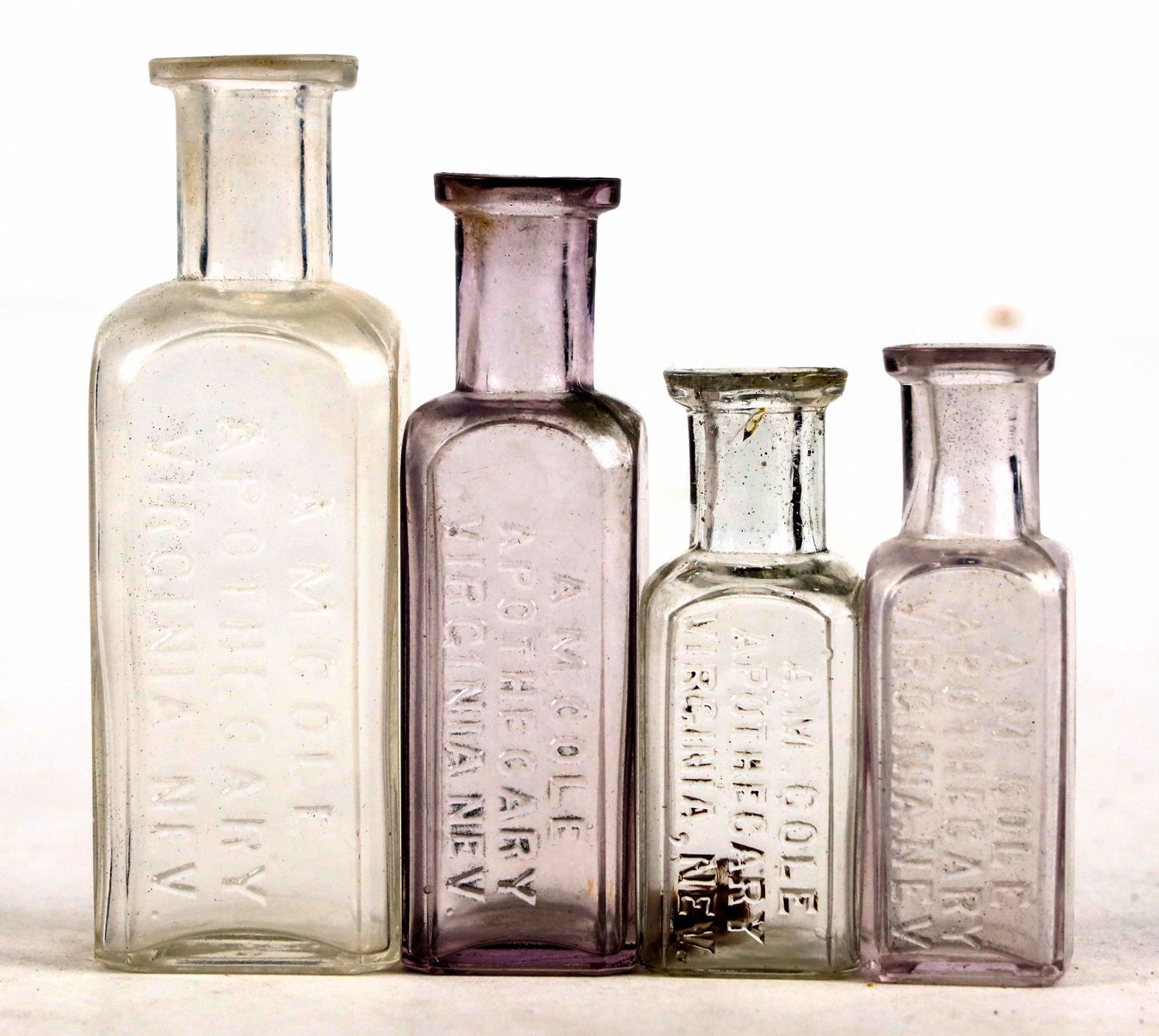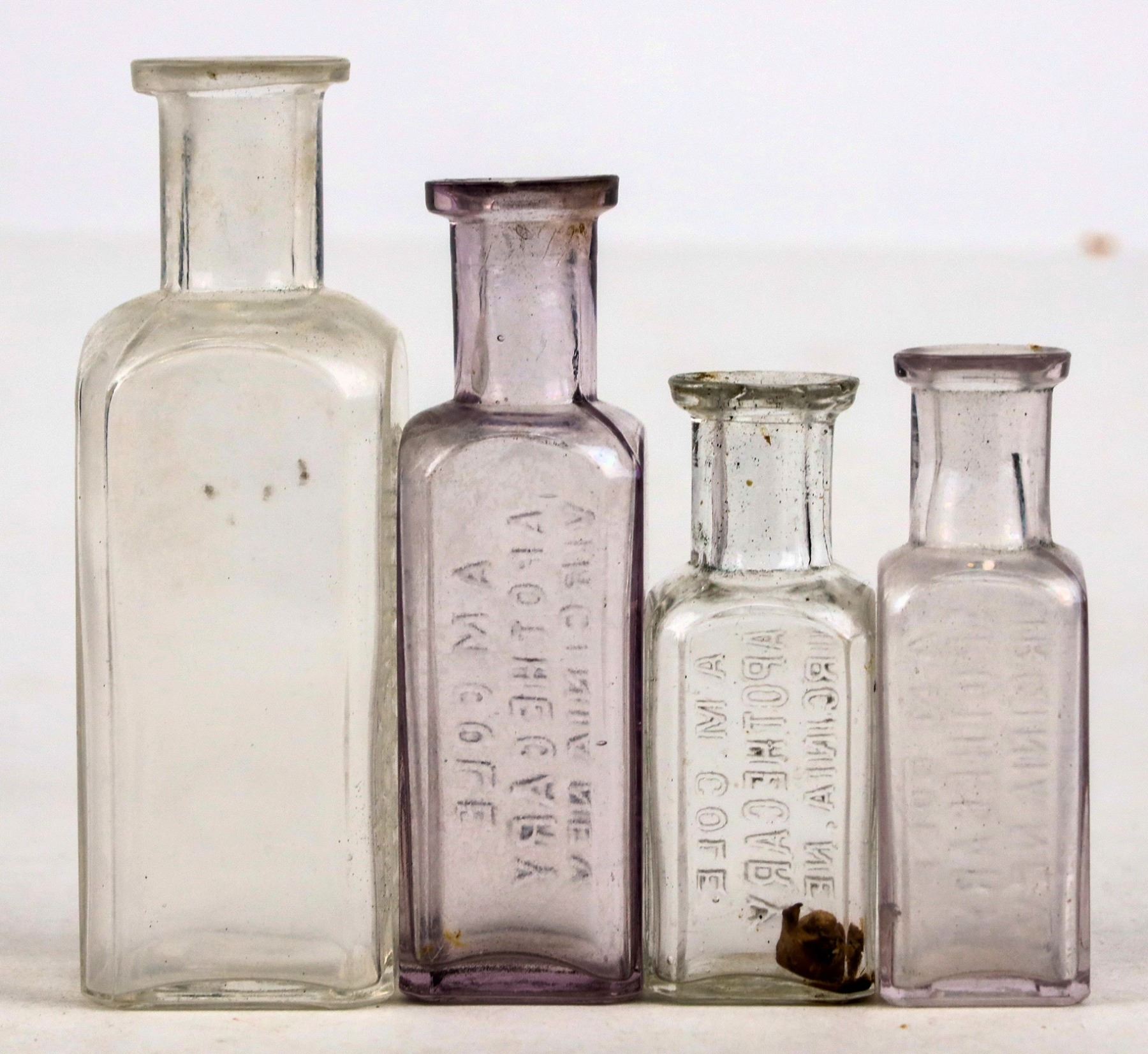 Lot of 4. A.M. Cole Apothecary small bottles, clear embossed lettering. No chips or cracks. One has a piece of cork inside. Excellent condition with very little residue.