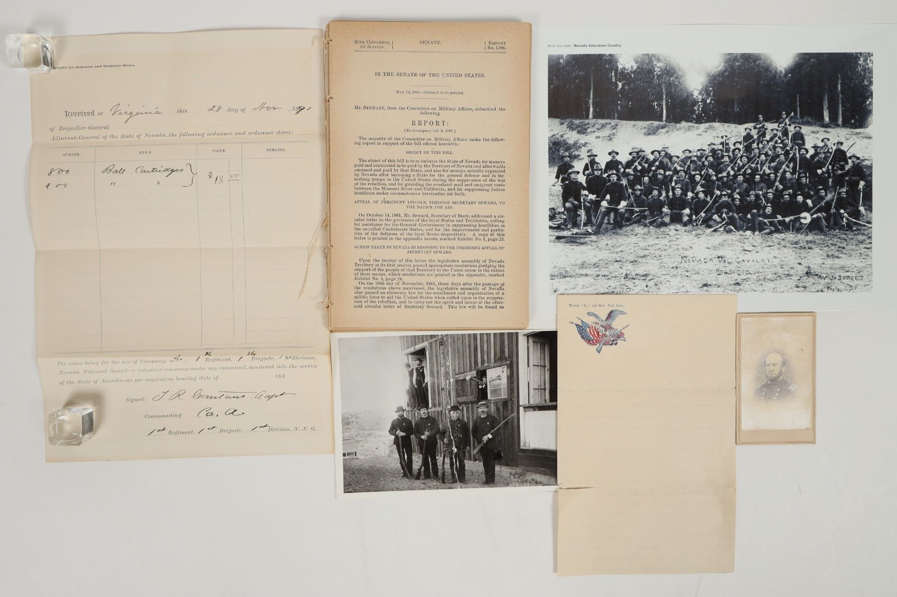 Lot of (7) various items, multiple formats. A 153-page report (no cover, dis-bound) from the US Senate, May 14 1988 from the Committee of Military Affairs, to reimburse monies for the two regiments of Volunteers who served from 1861 to 1865. A photo of the Virginia City National Guard from 1895 (seven men pictured). A photo card from Jacob L. Van Bokken, Provost Marshal of Nevada. 8x10 photo print of the Nevada Volunteer Calvary at the Presidio in San Francisco. A receipt for 'Ordnance and Ordnance Stores' issued to Capt. J.R. Constant in Virginia City, Storey County, 1891. A stationary piece with Troop 'A' 1st Vol. Cav. letterhead. This appears to have had writing once, now apparently faded out. Finally, a Nevada Volunteer bronze medal, 32 mm in diameter, EF condition. Still retains the suspension loop. Truly a historical Nevada group, please see photos.