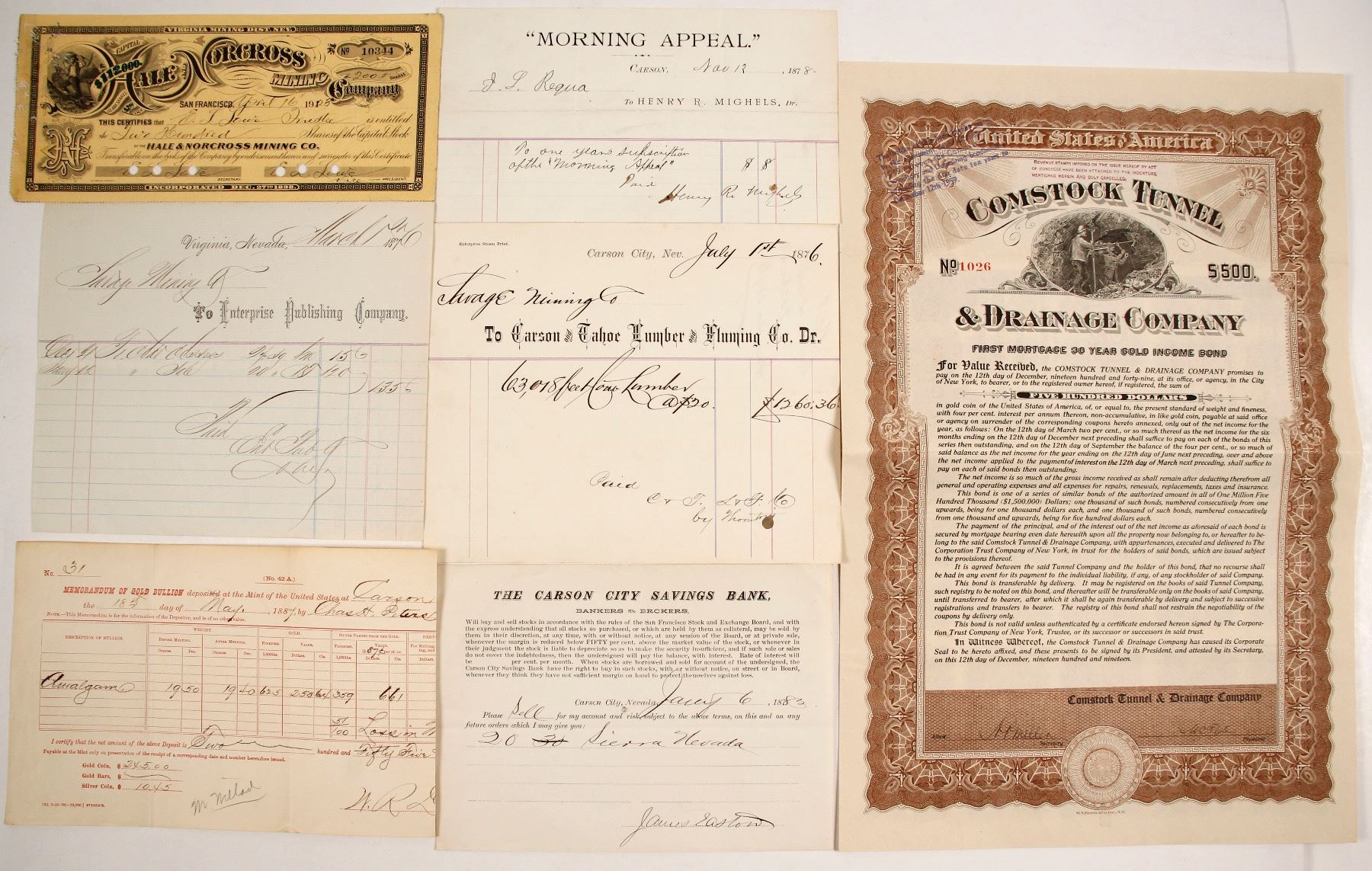 Lot of seven. 1) Comstock Tunnel & Drainage Company First Mortgage 30 Year Gold Income Bond. 1919. All 60 coupons are attached. Extremely fine condition. 2) Carson City Mint Assay receipt. 1887. For 19.5 ounces of amalgam by Charles H Peters. Total value $255. Signed by WR Davis. 3) 1876 Carson & Tahoe Lumber & Fluming billhead. To the Savage Mine for 63,018 feet of lumber. 4) 1876 Enterprise Publishing Company billhead (Territorial Enterprise). 5) 1878 Morning Appeal billhead. Issued to Isaac Requa and signed by Henry R Michels. 6) Receipt from the Carson City Savings Bank for the selling of 20 shares of Sierra Nevada stock. 1883. 7) 1923 Hale & Norcross stock certificate. Hole cancelled. Date: 1876-1925 City: Virginia City State: Nevada HWAC# 74487