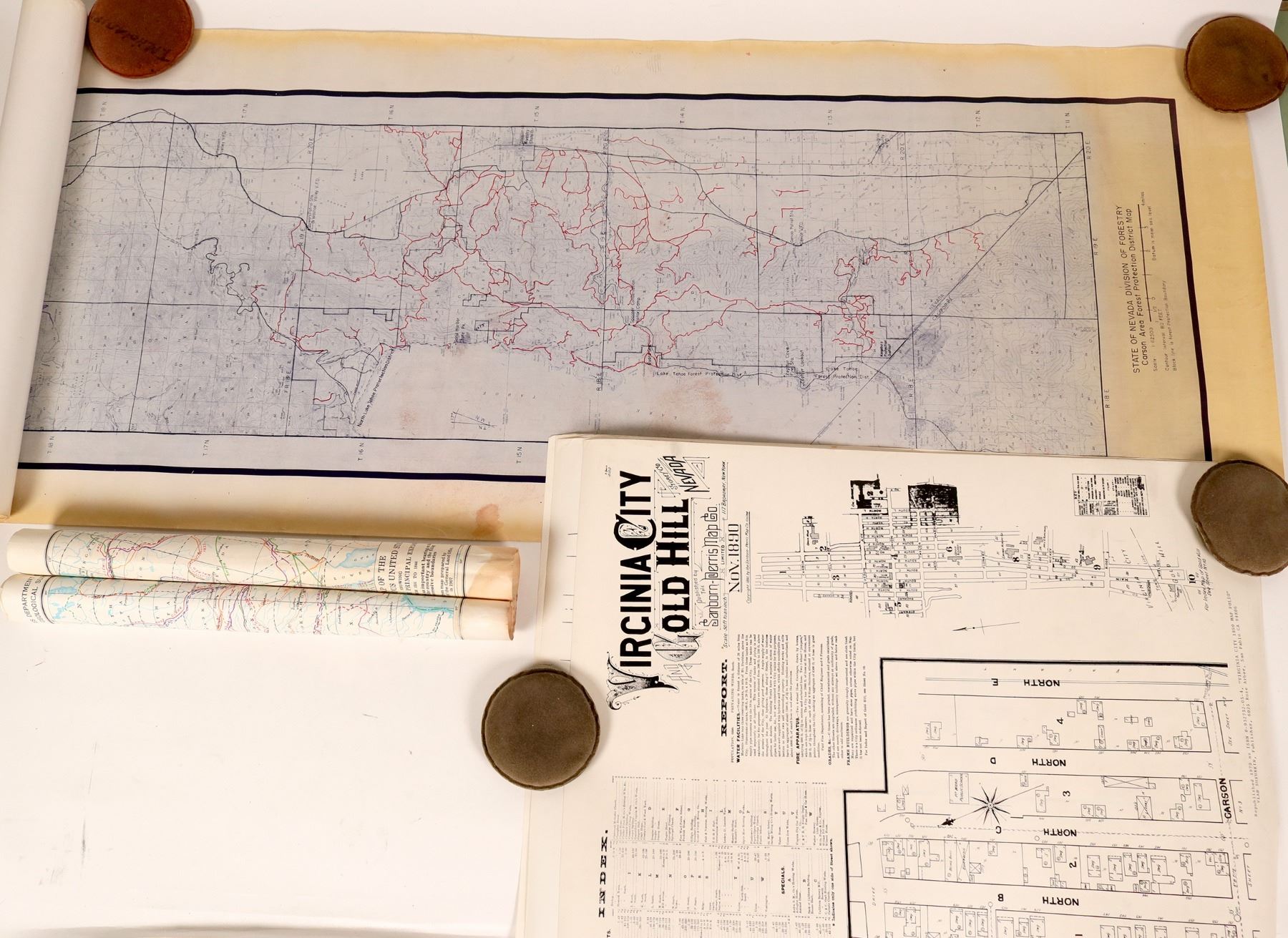 Fifteen maps, 20 x 25 inches each, published by Sanborn Perris Map Company, November 1890.1982 Reproductions. Often used for bottle digging, showing where old buildings were located. Also a reproduction of a map of the Gold Hill front lodes, and department of forestry maps covering Reno to Genoa, Nevada. And a 1982 reproduction of a 1907 map showing routes of primary explorers across the United States, from 1501 to 1844. 24 x 18 inches, historically fascinating.
