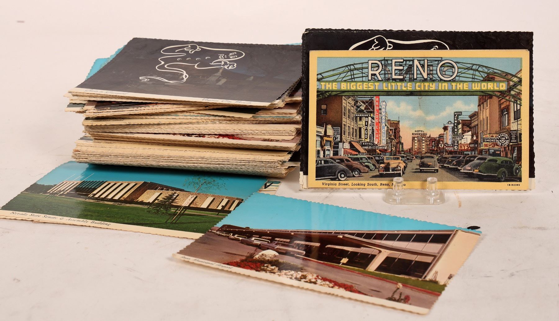 About 200 c. 1950's-60's mostly color Virginia City and Reno postcards. Piper's Opera House, Gould and Curry Mine Office, cemetery, airport, hotels, Bucket of Blood Death Wagon etc. Many dupes. Nevada