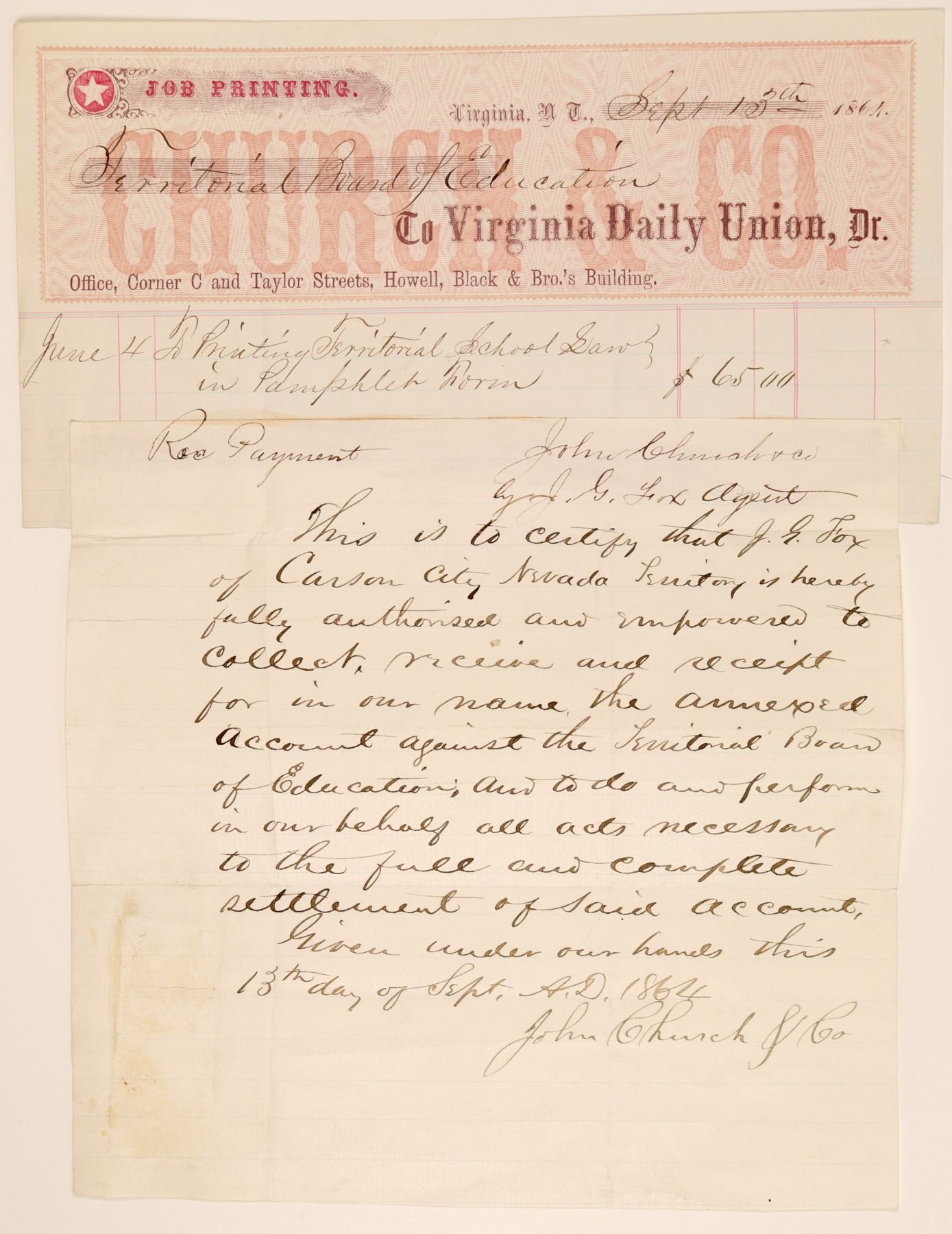 Rare Territorial Virginia Daily Union (1862-1867) Billhead. Underprint on the billhead says Church & Co. In February of 1862 John H Church, SA Glessner and JL Laird purchased the Carson City Silver Age. It was the paper that began printing in Carson City when the Territorial Enterprise moved to Virginia City in December of 1860. Church & Company moved the Silver Age plant to Virginia City and on November 4, 1862 began printing the Virginia Daily Union. This is a bill for printing the Territorial School Law in Pamphlet form. Note attached which J. Fox is authorized to pay this bill. City: Virginia City State: Nevada Date: 1864