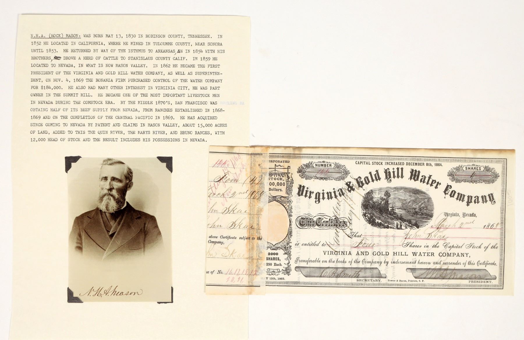 Very rare. Incorporated 1863. No. 144, issued for 4 shares to John Sake in Virginia City in 1868. Signed by president NH Mason and secretary Smith. Pen cancelled. Vignette of people above river. Stub adhered to left of certificate. Wrinkles, discoloration (present on all the examples we have seen). 5 x 10.5" These came out of the Virginia & Gold Hill Water Company safes. John William "Johnny" Skae rose from humble Canadian origins to become a millionaire in Virginia City's silver boom, exploiting his telegraph operator job to intercept mining stock tips and buy shares on margin until prices soared to $1,000 a share. He gained fame for lavish parties and was even featured by Mark Twain, but when his insider edge vanished, his fortune collapsed and he died destitute. Skae's dramatic rise and fall led the California Telegraph Company to bar employees from owning mining stocks, a precedent for later insider-trading rules. The Virginia & Gold Hill Water Company was incorporated in the early 1860s, a consolidation of the Virginia Water Co. and Gold Hill Water Co. Finding safe, good tasting drinking water on Mount Davidson was an early problem for the Comstock miners. It wasn't until this company was reincorporated in 1871 and purchased by W.S. Hobart and the Bonanza Firm (Fair, Mackay, Flood, O'Brien) that a stable water source was found and exploited. The new owners had a plan to bring water from the Hobart Creek and Marlette Reservoir area 1,500 feet above Lake Tahoe. They hired Hermann Schussler, a noted hydraulic engineer, who constructed a pipe line from Marlette down to the Washoe Valley and back up the other side to Virginia City in a reverse siphon process. This required a pipe line 7 miles long and 11.5 inches in diameter. The water pressure exceeded 200psi. The pipeline was completed July 25, 1873. When the water started flowing, residents could trace the progress of the flow by the sound of the blow-off valves opening to release trapped air. Virginia City journalist Dan DeQuille wrote: "Compared with what was heard when these cocks blew off, the blowing of a whale was a mere whisper." It transported two million gallons a day. By 1887, two more pipelines had been laid to supply water to the Comstock. The Virginia and Gold Hill Water Company was purchased by Storey County over 100 years later. It is still providing water to citizens of Virginia City.