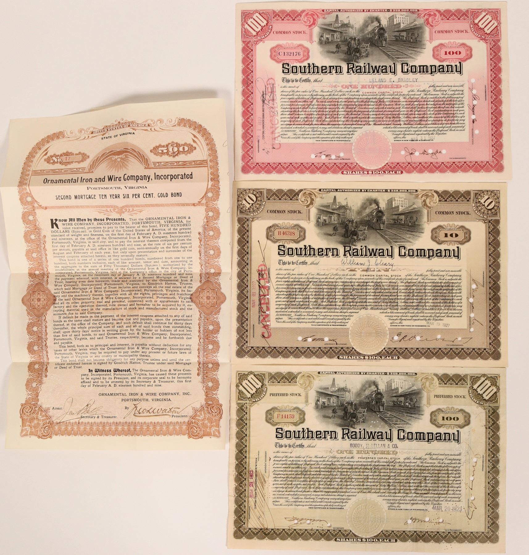 1. Ornamental Iron and Wire Company, Inc. Bond - 1 Gold Bond, with 20 coupons attached. Ornate mauve border. 9.75' x 15.25". 2. Southern Railway Co. - 3 certificates. Incorp June 1894. All $100 par, I/C, embossed seal, vignette top loco in rail yard scene. Stock type in certificate color underprint. American Bank Note Co. printer. VF. #B46318, BROWN, 10 shares common stock (printed upper corners) issued Mar 19, 1927. #C132176, RED, 100 shares common stock (printed upper corners) issued Mar 31, 1837. #F14159, GREEN, 100 shares preferred (printed upper corners) issued Mar 20, 1923.