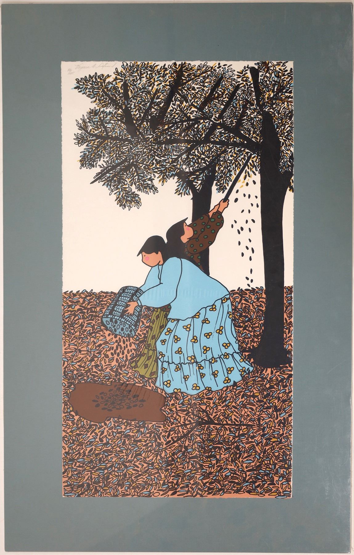 Illustration of two women shaking acorns off tree by Virginia Stroud. Could be an illustration for a children's book.