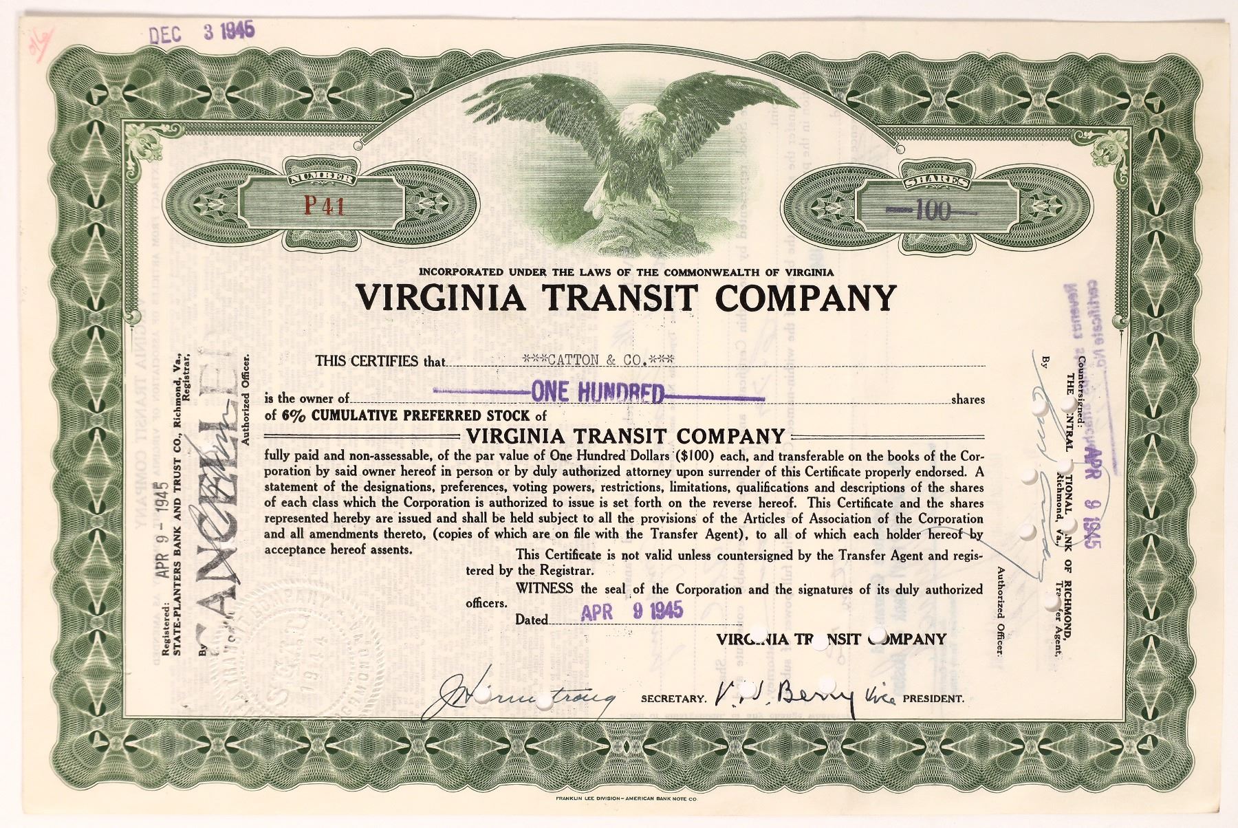 Virginia Transit Co. stock, issued to Catton & Co. for 100 shares, cert no. P41 on Apr. 5, 1945. Signed by V. W. Berry as VP. The Great WW2 was over 30 days later.