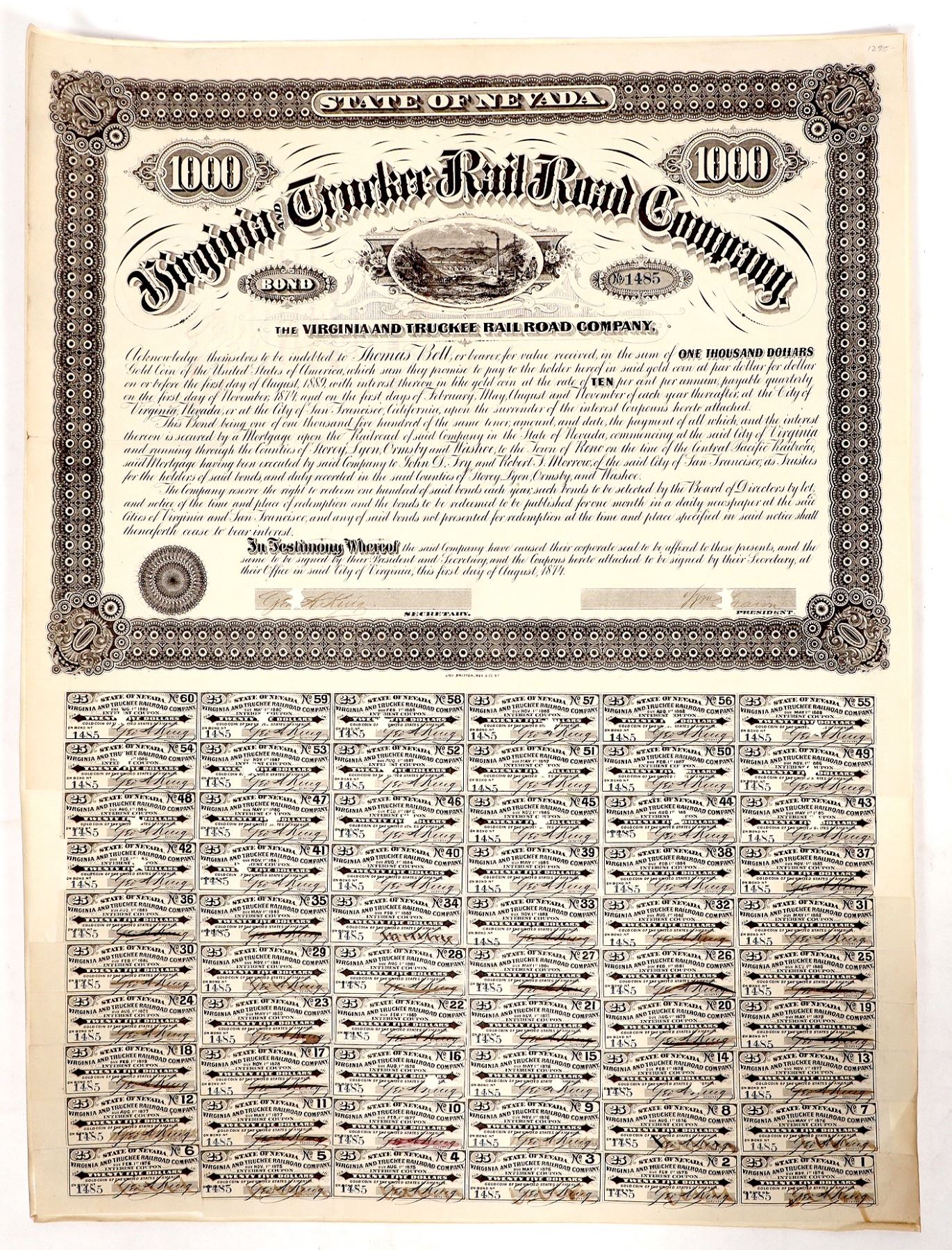 $1000 bond certificate from the Virginia and Truckee Railroad Company, dated 1874. No. 1485 issued. Signed by company president William Sharon and secretary George A. King with cancellation holes through both signatures. Nice railroad vignette and embossed company seal. 60 bond coupons, each worth $25, are attached to the certificate; the entire piece is mounted on tightly cut cardstock. Great quality, especially considering the piece's age -- no foxing and very little wear.