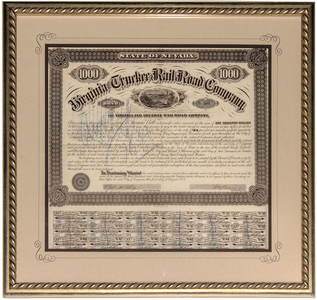 Bond certificate issued by Virginia & Truckee Rail Road Company to Thomas Bell. Bond is in the amount of $1000. It is signed by company secretary George King and president William Sharon. Framed and mounted piece measures 22" x 23" has some fold creasing and has been hand canceled with blue ink. All premium coupons are attached. This piece is ready to hang and would be a great addition to any Comstock, V&T, or railroad collector's inventory. (Toth V&T collection)