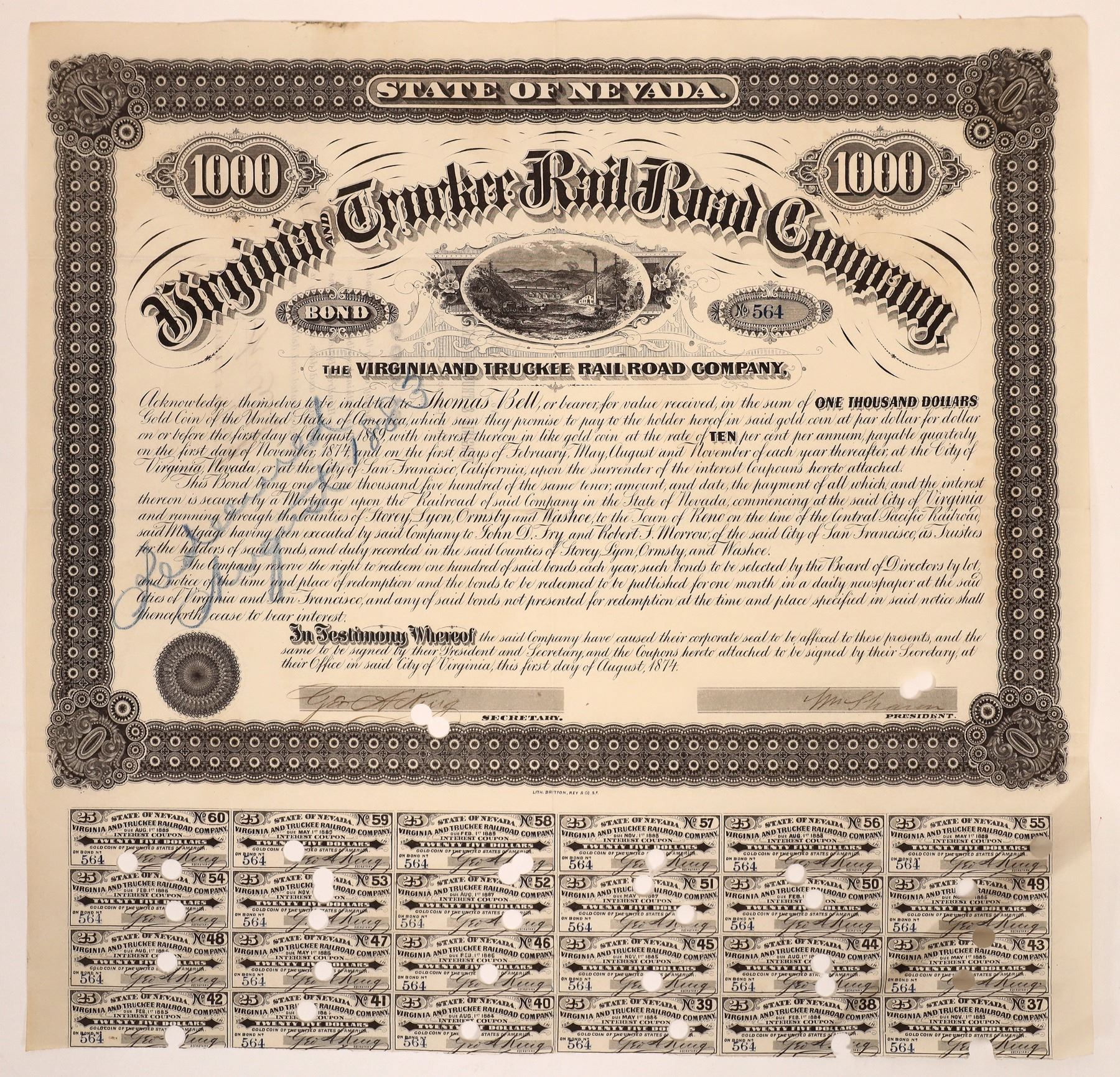 Large format bond with classic NV mining vignette, bond no 564. 1874. 1500 bonds were issued from the railroad, from VC to Reno and the line of the central pacific railroad. Trustees include John D Fry a Comstock millionaire and Robert Morrow. Sharon signed this piece at lower right. 24 coupons attached. Sharon's signature unaffected by 2 hole punch cancels. Scarce with a nice clear signature like this one!