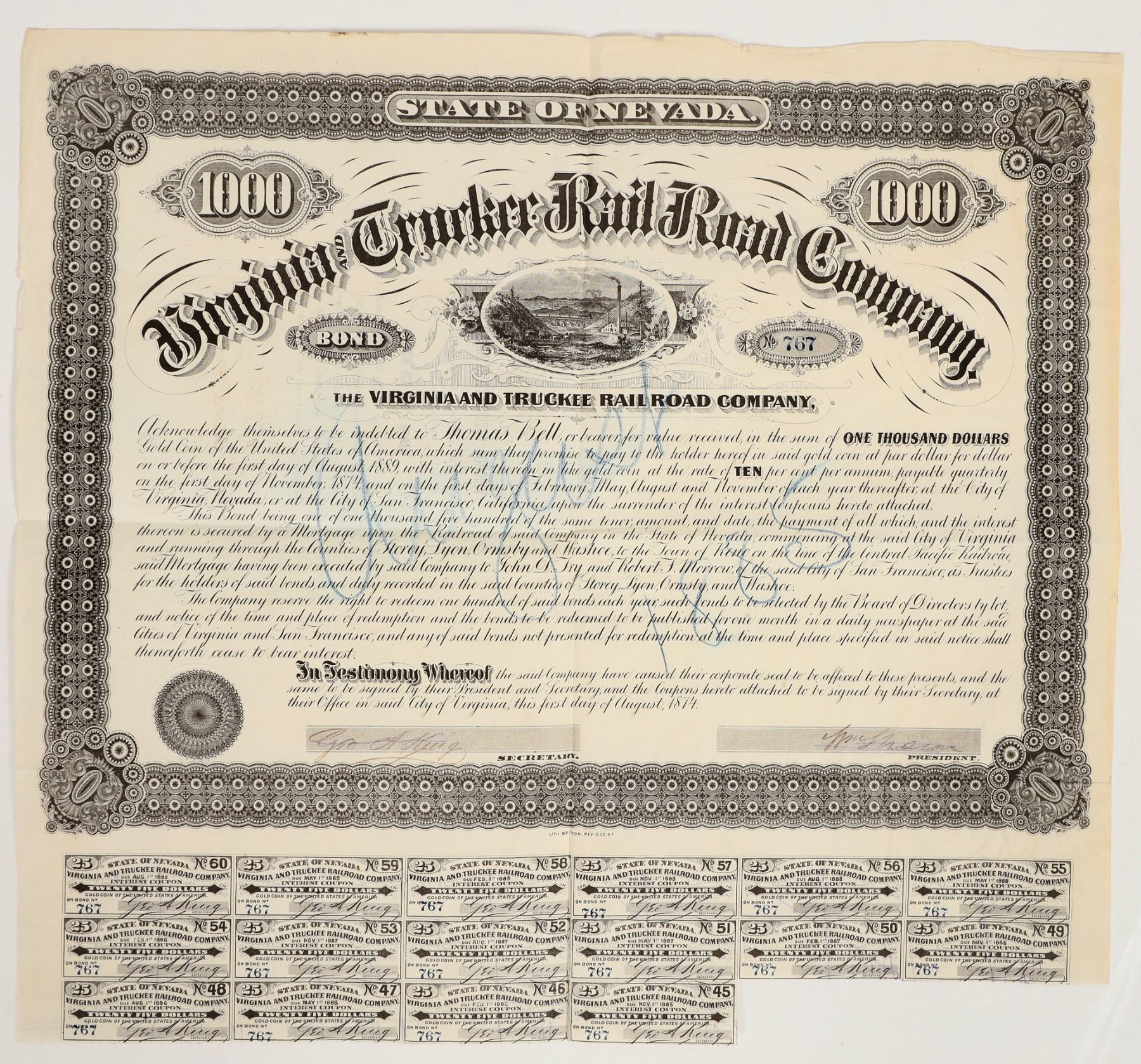 $1000 bond issued August 1874. Signed by president William Sharon and secretary Geo. A. King. Light blue pencil cancel over signatures. 16 coupons attached. Mining vignette. 15.5 x 17" Rare to find Sharon's signature not punch cancelled. William Sharon (1821-1885) was a powerful Nevada silver magnate, banker, and politician closely tied to the Comstock Lode. As the Nevada agent of the Bank of California, he financed mines, acquired vast properties, and was instrumental in creating the Virginia & Truckee Railroad, which carried ore and supplies between the Comstock, Carson River mills, and the Central Pacific connection. He later served as a U.S. Senator from Nevada (1875-1881), though his legacy is marked by both immense wealth and controversy over ruthless business practices and personal scandals.