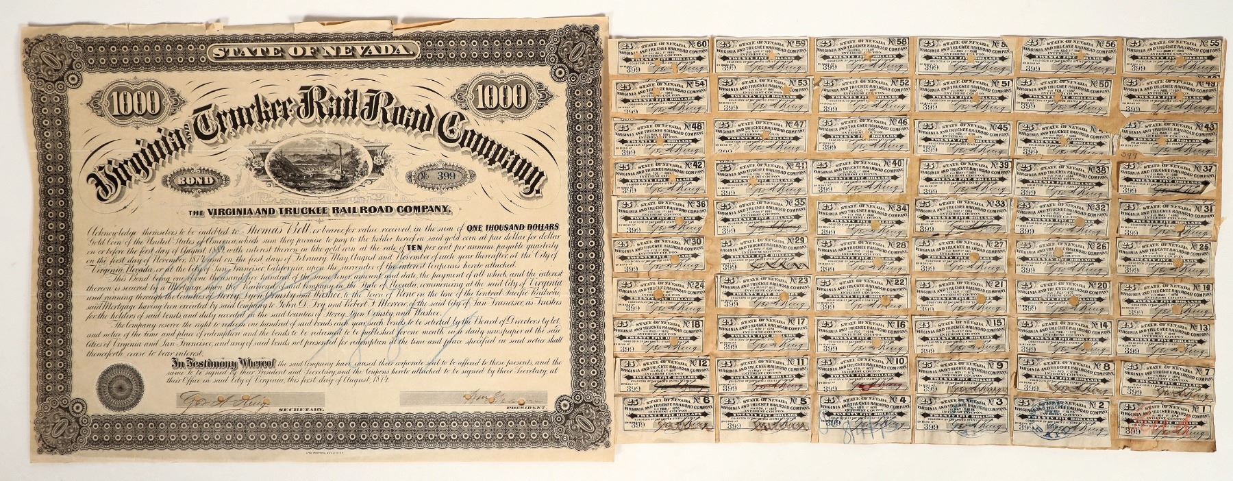 $1,000 bond to Thomas Bell, issued in August 1874. Signed by William Sharon as president and Geo. King as secretary. Punch cancelled signatures. Black border and print with mining vignette by Britton, Rey & Co. Mounted on paper. Comes with coupons also mounted on paper. 12 x 16" Toning. Sharon was one of the most powerful men on the Comstock, running the Bank of California for William Ralston. The bank made a fortune by loaning to mining companies and then seizing their properties when they defaulted. Sharon was instrumental in the creation of the Virginia and Truckee Railroad, which he wanted to connect the Comstock with the ore mills he owned along the Carson River (with Ralston). Later in life, he also served as a U.S. senator.