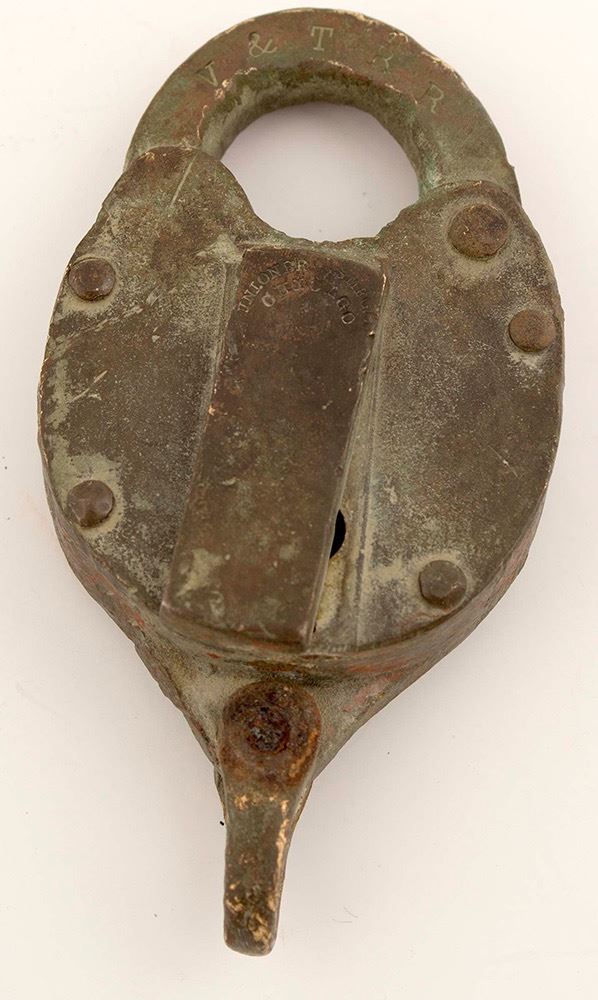 This is a rare padlock from The Virginia & Truckee Railroad. It measures 2.50"x 5" closed. It is frozen shut, but the V&T RR logo is very prominent. VERY collectible. Date: Location: Nevada HWAC# 56423