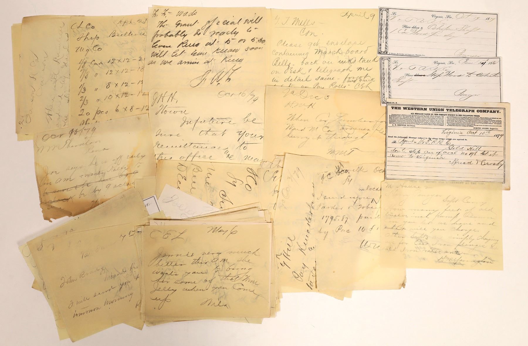 A pile of about 40 handwritten telegrams concerning the Virginia & Truckee railroads need for lumber. Henry Yerington, Abe Curry and many other local personalities involved. Also telegrams concerning the Carson Lumber Company.