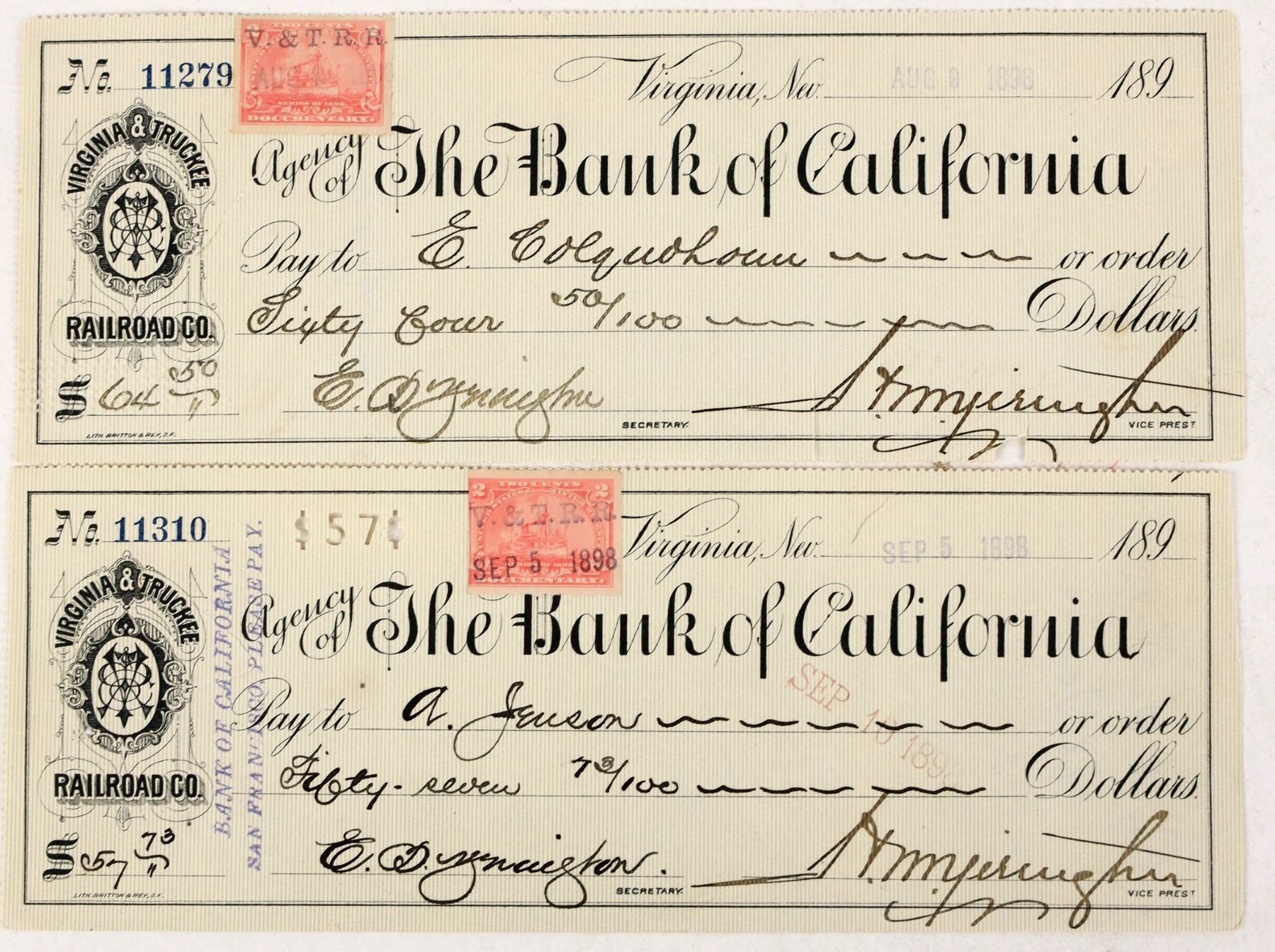 Lot of 2 V&T Railroad checks issued in 1898. Both signed by Henry Yerington as vice president and ED Yerington as secretary. Henry Yerington was the longtime superintendent of the railroad. Both have 2 cent stamps with V&T cancels.