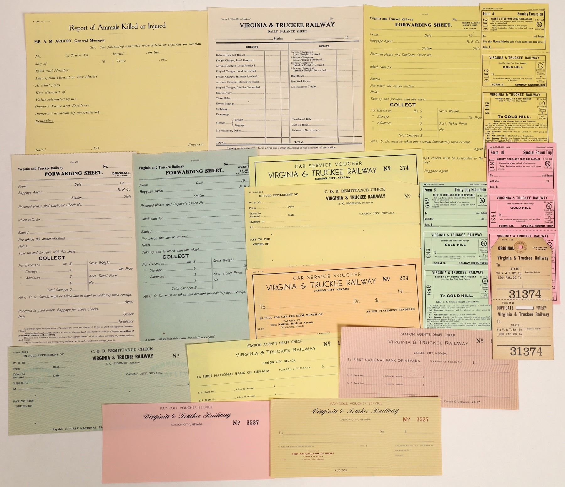 Lot of seventeen office paperwork forms from the Virginia and Truckee Railroad. Baggage tag, Sunday excursion ticket; Payroll Voucher; Station Agent's Draft Check; Report of Animals Killed or Injured. None of the forms are filled out, all blank.