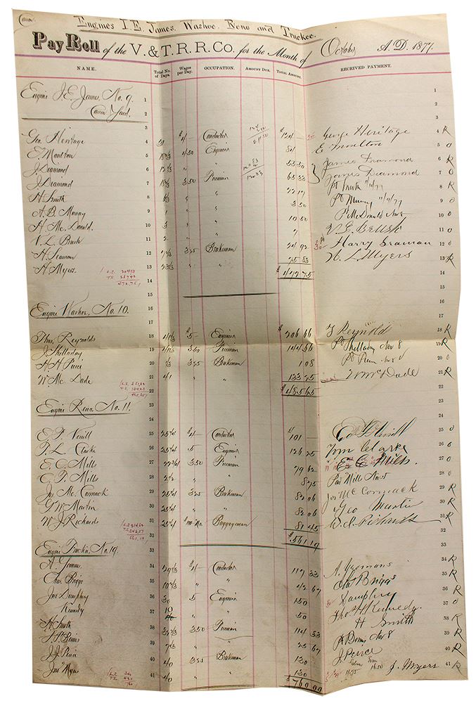 Large (18" x 11.5") pay roll sheet for the railroad, October 1877. Lists the following Engines and each engine's employees (w/ wages, and signatures): J.E. James No. 9 (Carson Yard), Washoe No. 10, Reno No. 11, and Truckee No. 19. Besides original folds and very light soiling, this document is in great condition.