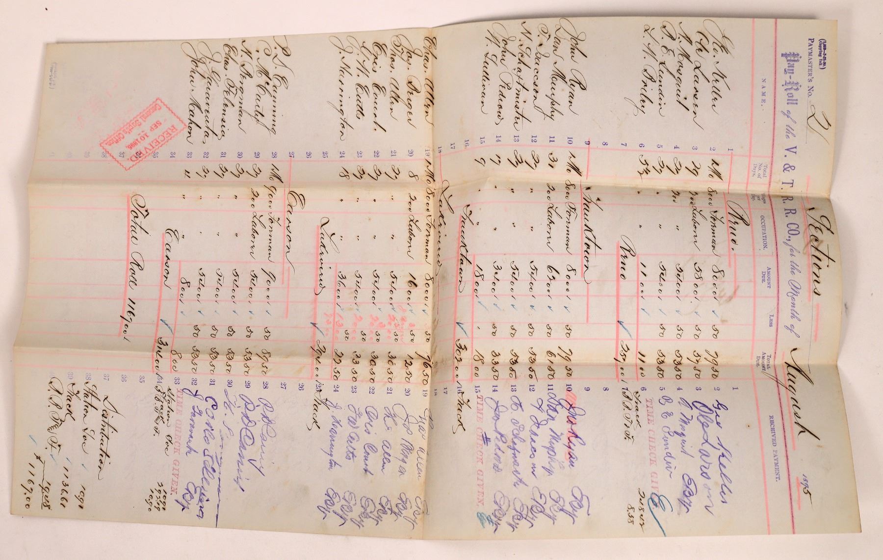 Issued for section 2 in August of 1895. That section included payments to Reno, Franktown, Lakeview and Carson. Each station included one foreman and four of five laborers. Signed by the men who were paid. 18 x 11 inches on hard stock paper. Elcano Nevada History Collection.