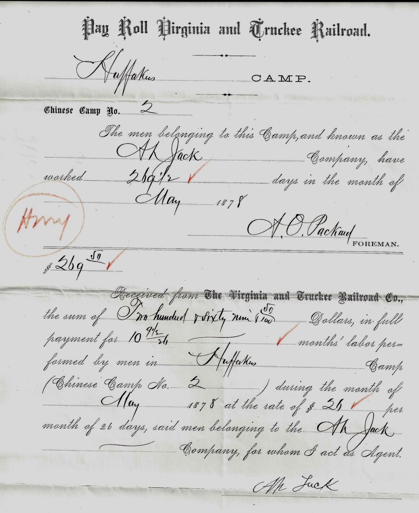 This is an amazing piece of Nevada railroad and Chinese history. It is an 1878 payroll for the month of May for the Chinese working out of Chinese Camp #2. It is for $269.50 or for monthly pay for 11 Chinese laborers. To the Ah Jack Company. Ah Jack frequently supplied Chinese labor to Henry Yerington companies. He also served as an interpreter for Yerington. Initialed by Henry M Yerington in red. AO Packard was the foreman and signed the payroll. The 1880 census lists him as a 'roadbed and track layer'. Huffaker's Camp was just outside of Reno (inside the city boundaries today) and was the confluence of 6 or 7 logging flumes and the V&T Railroad. Many more notes are included! State: Nevada City: Huffaker's Camp, Washoe Date: HWAC# 99619