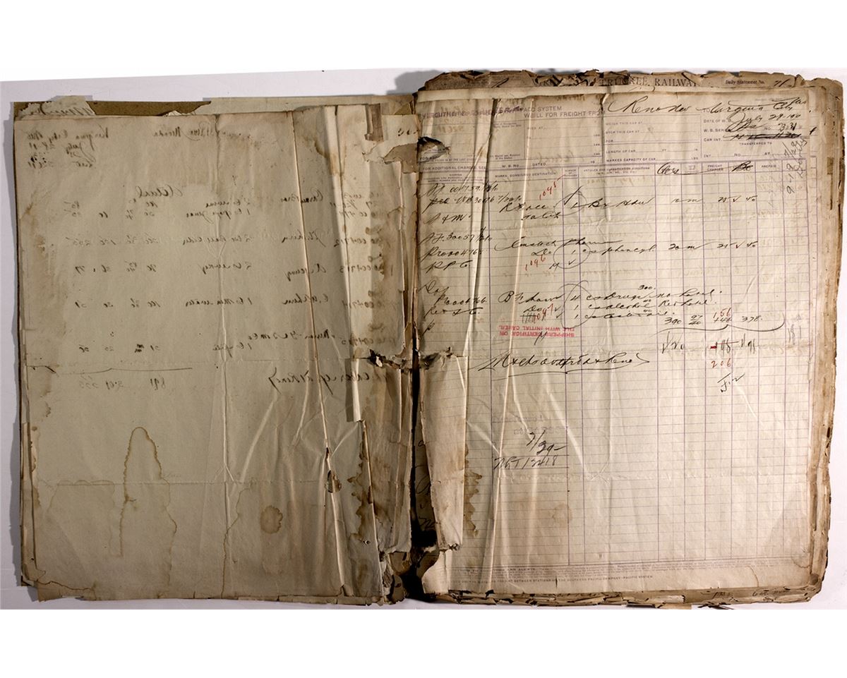 Large ledger book of shipping bills from "Southern Pacific Company - Pacific System Way Bill for Freight from Reno," for the V & T Railroad. All hand-written, very legible. Pages measure 14" x 17". Book and pages are well-worn, and some pages are loose and torn. Acceptable condition, some staining. A rare look at turn-of-the-century railroad shipping.